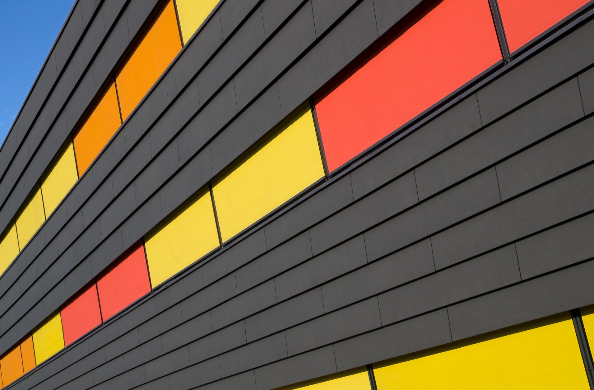 Edificio de paneles negros con inserciones multicolores