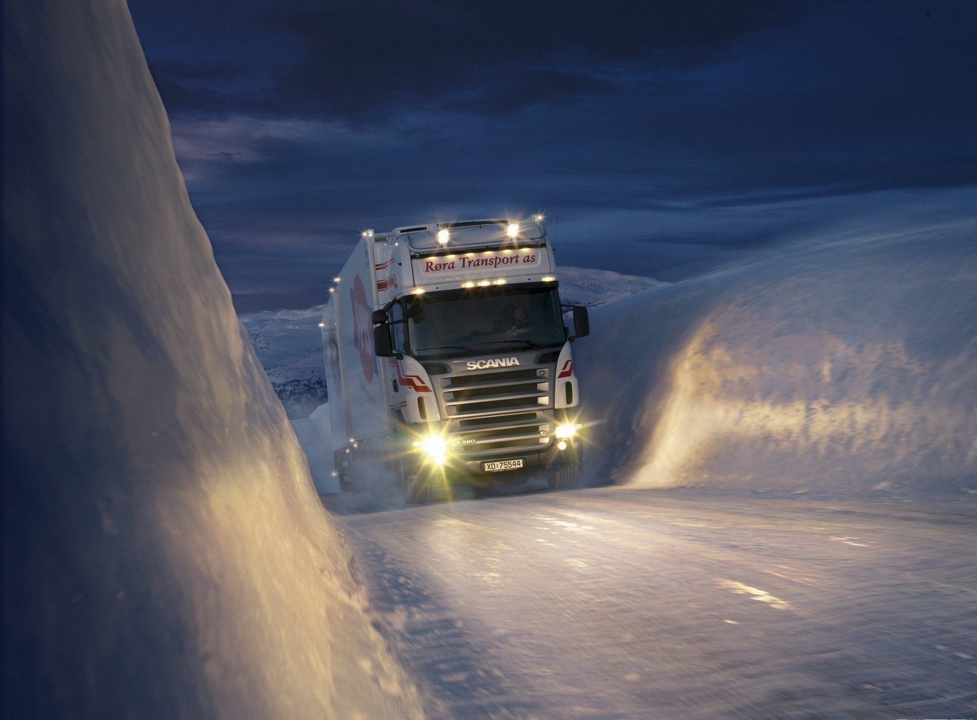 Un camión blanco se abre paso a través del hielo contra el cielo nocturno