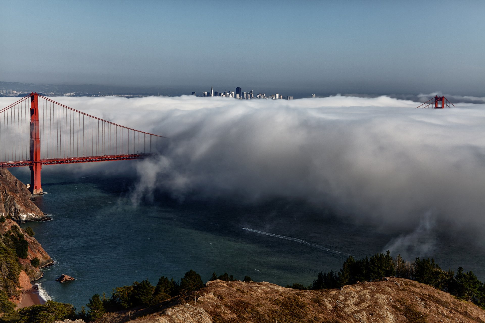 Niebla suave sobre un puente colgante en californiaNiebla suave sobre un puente colgante en California