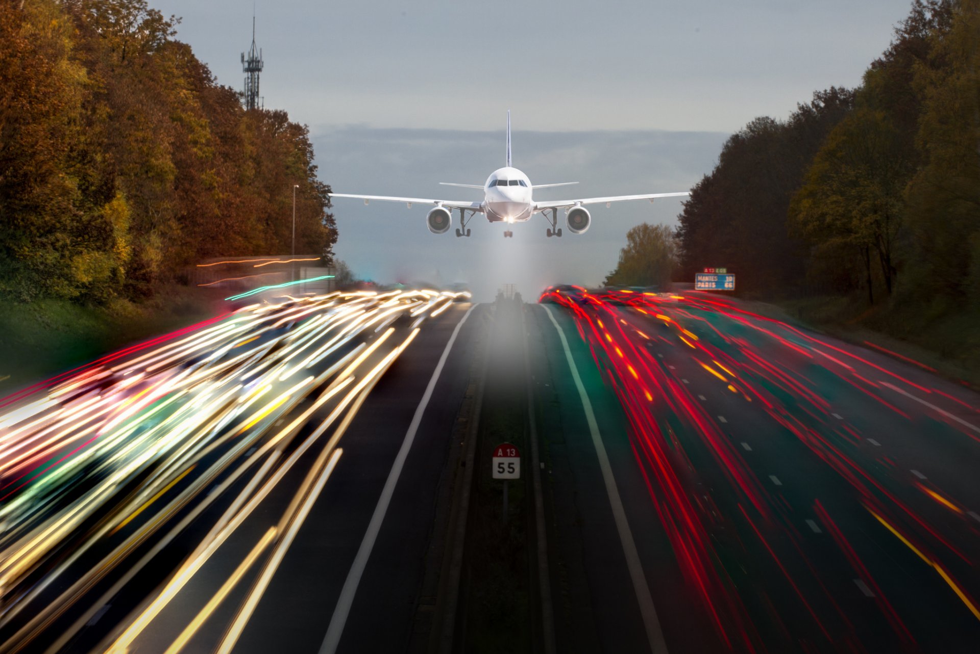 Un avión que vuela bajo sobre una carretera con rayas brillantesUn avión que vuela bajo sobre una carretera con rayas brillantes