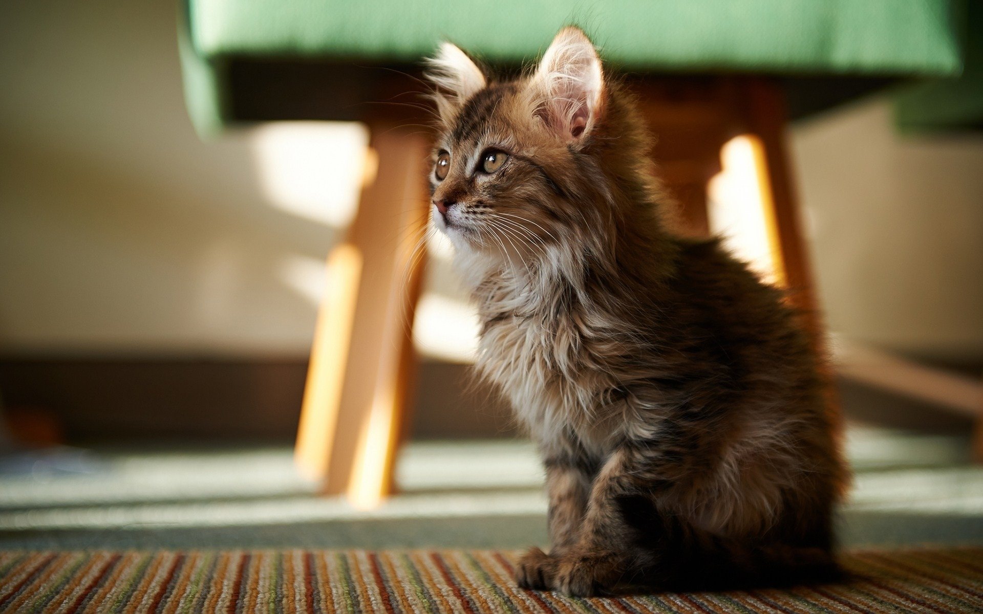Un gatito se sienta en el Suelo cerca de un taburete y Mira a lo lejos