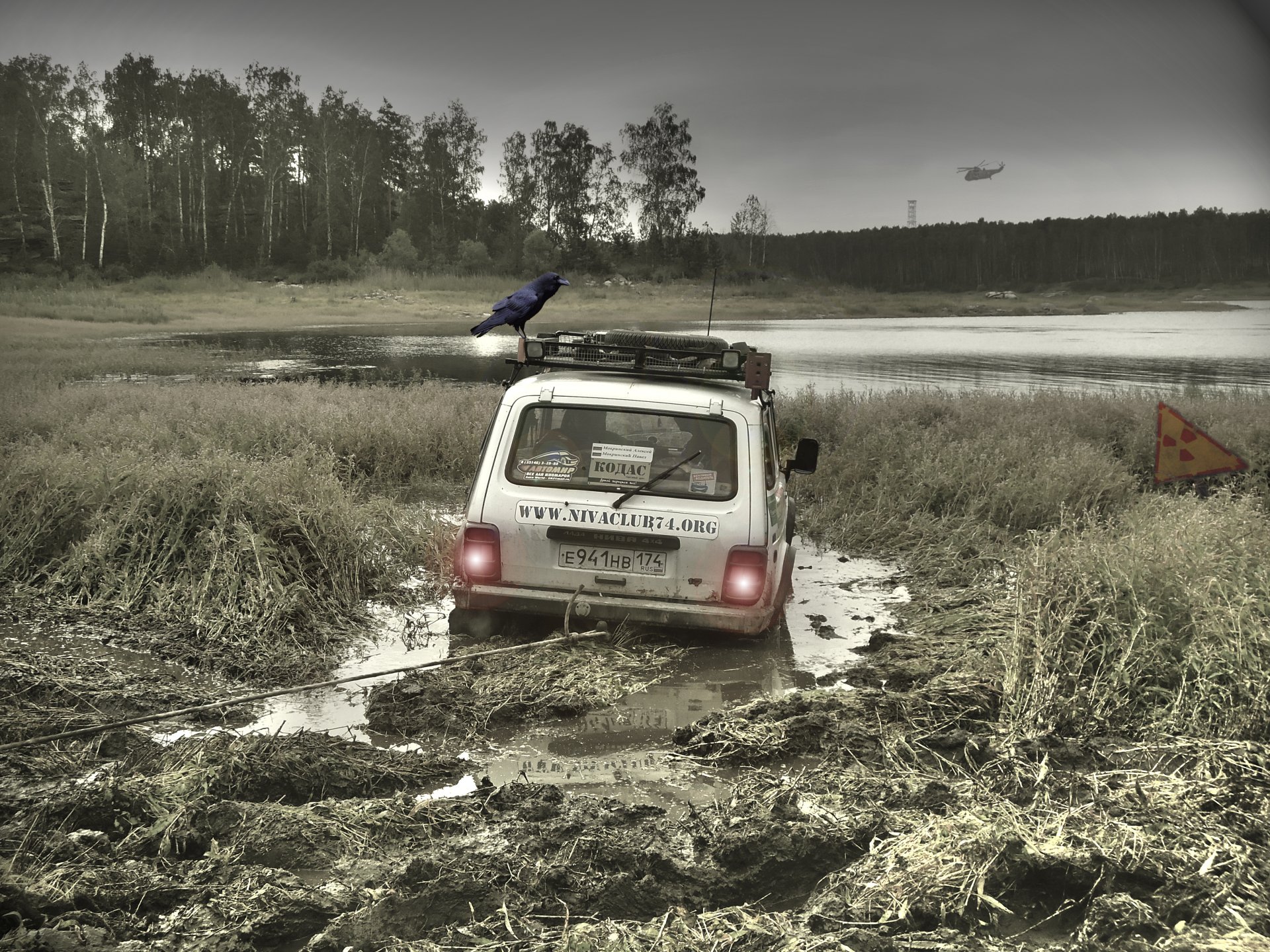 Un acosador de Chernobyl, Niva atrapado en el barro con un Cuervo en el techo. Alrededor del bosque y la radiación