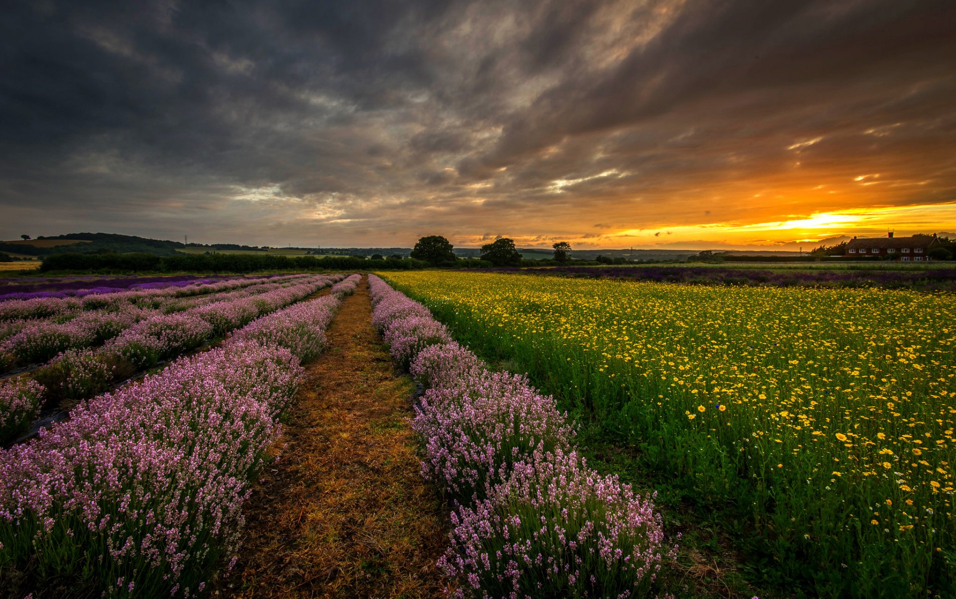 Puesta de sol sobre un campo de lavanda en inglaterraPuesta de sol sobre un campo de lavanda en Inglaterra