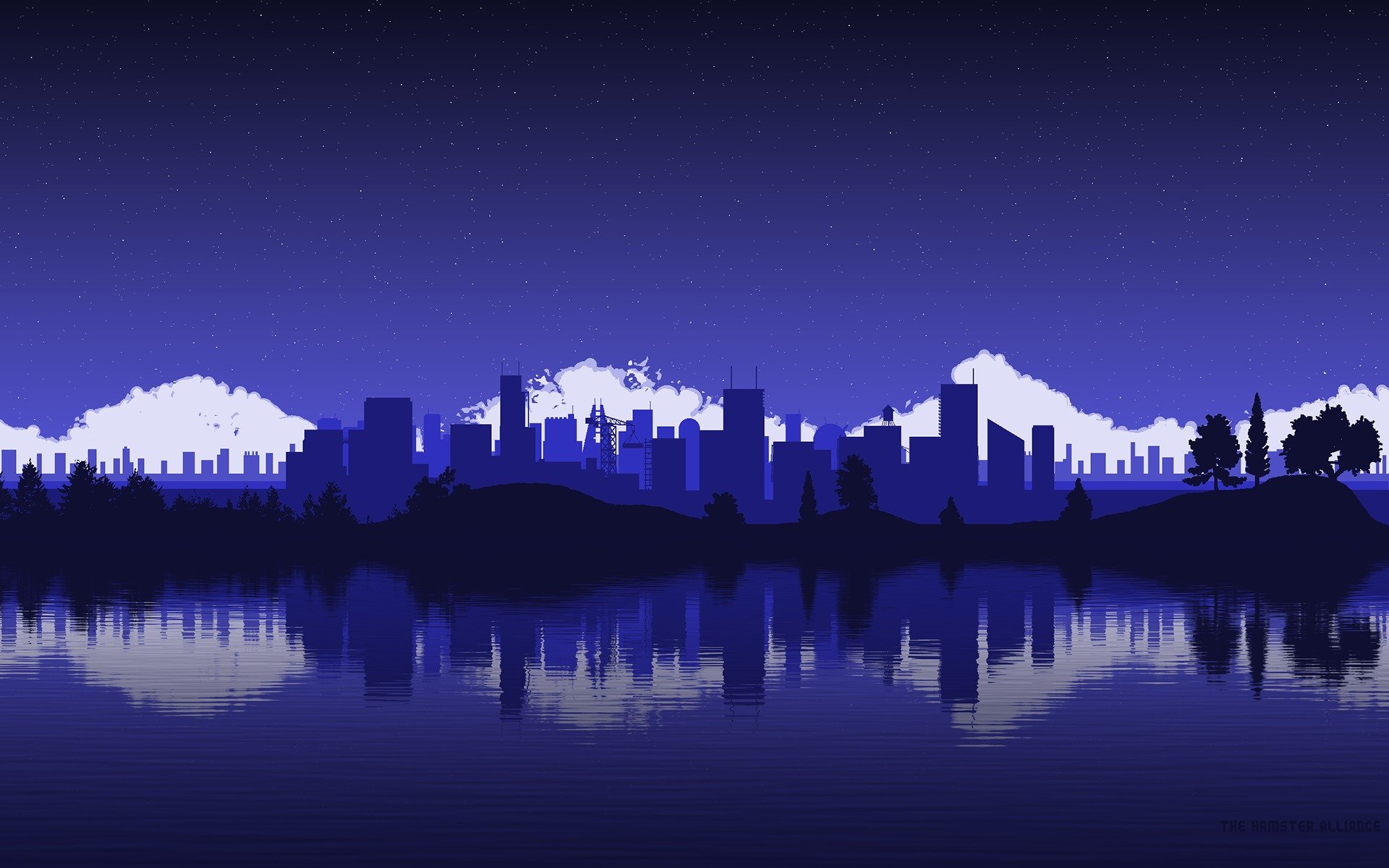 Las estrellas y los rascacielos se reflejan en el aguaLas estrellas y los rascacielos se reflejan en el agua