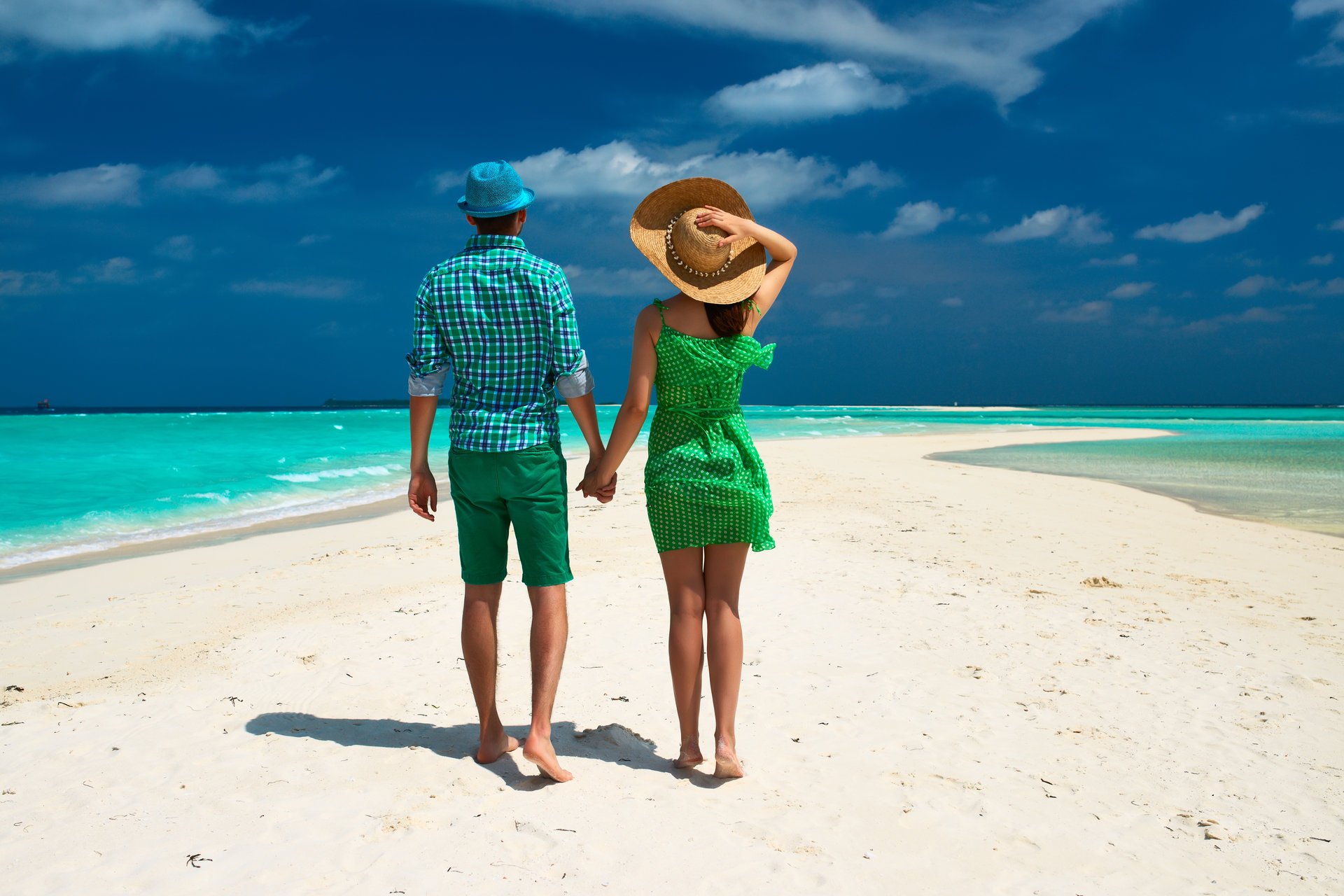 En los trópicos, una pareja pasea por la playa entre palmerasEn los trópicos, una pareja pasea por la playa entre palmeras
