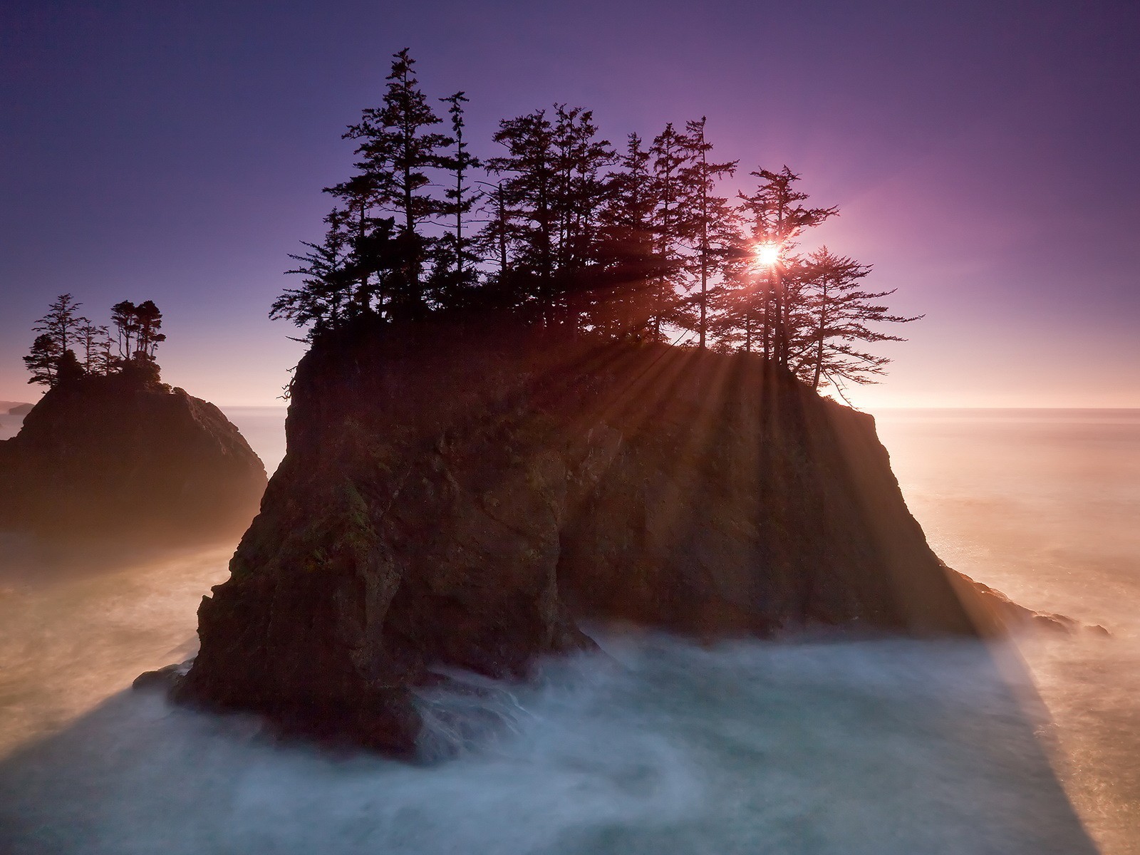 Árboles en la roca sol niebla