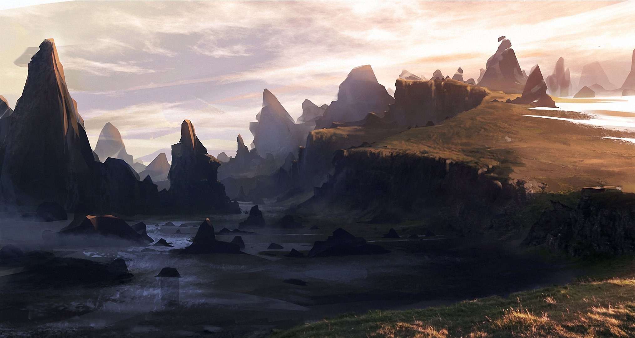 Terreno montañoso opaco con rocas y cuerpo de aguaTerreno montañoso opaco con rocas y cuerpo de agua