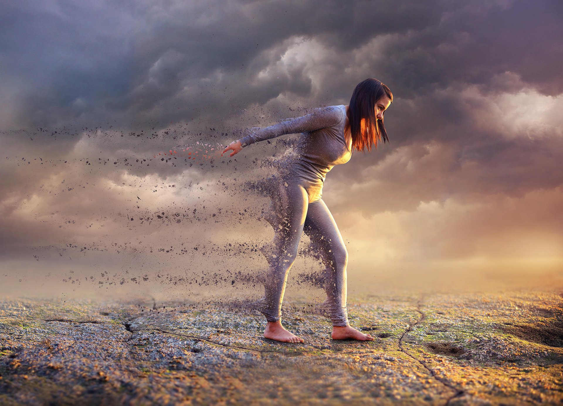 Chica en proceso de ruptura en el fondo de las nubes grisesChica en proceso de ruptura en el fondo de las nubes grises