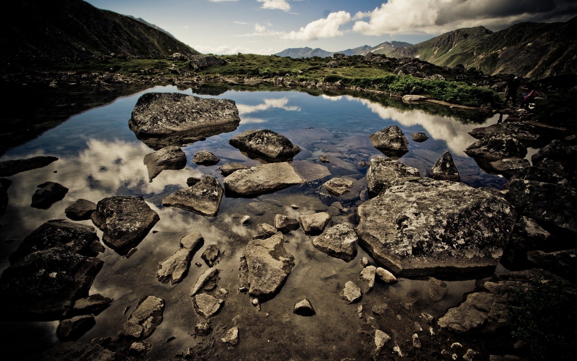 Lago de montaña. lago del bosque. reflejo de las montañas