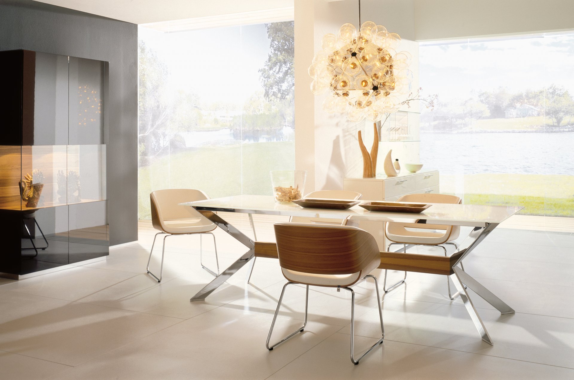 Foto del interior del restaurante, mesa, sillas y araña