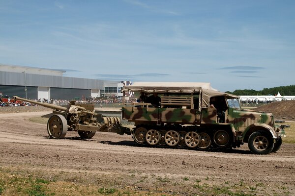 Cañón antitanque alemán en un tractor con pintura de camuflajeCañón antitanque alemán en un tractor con pintura de camuflaje