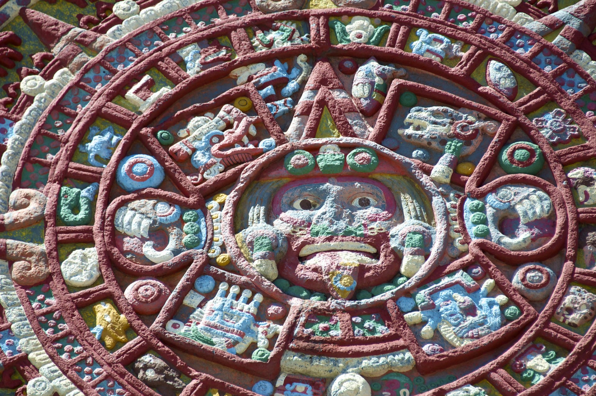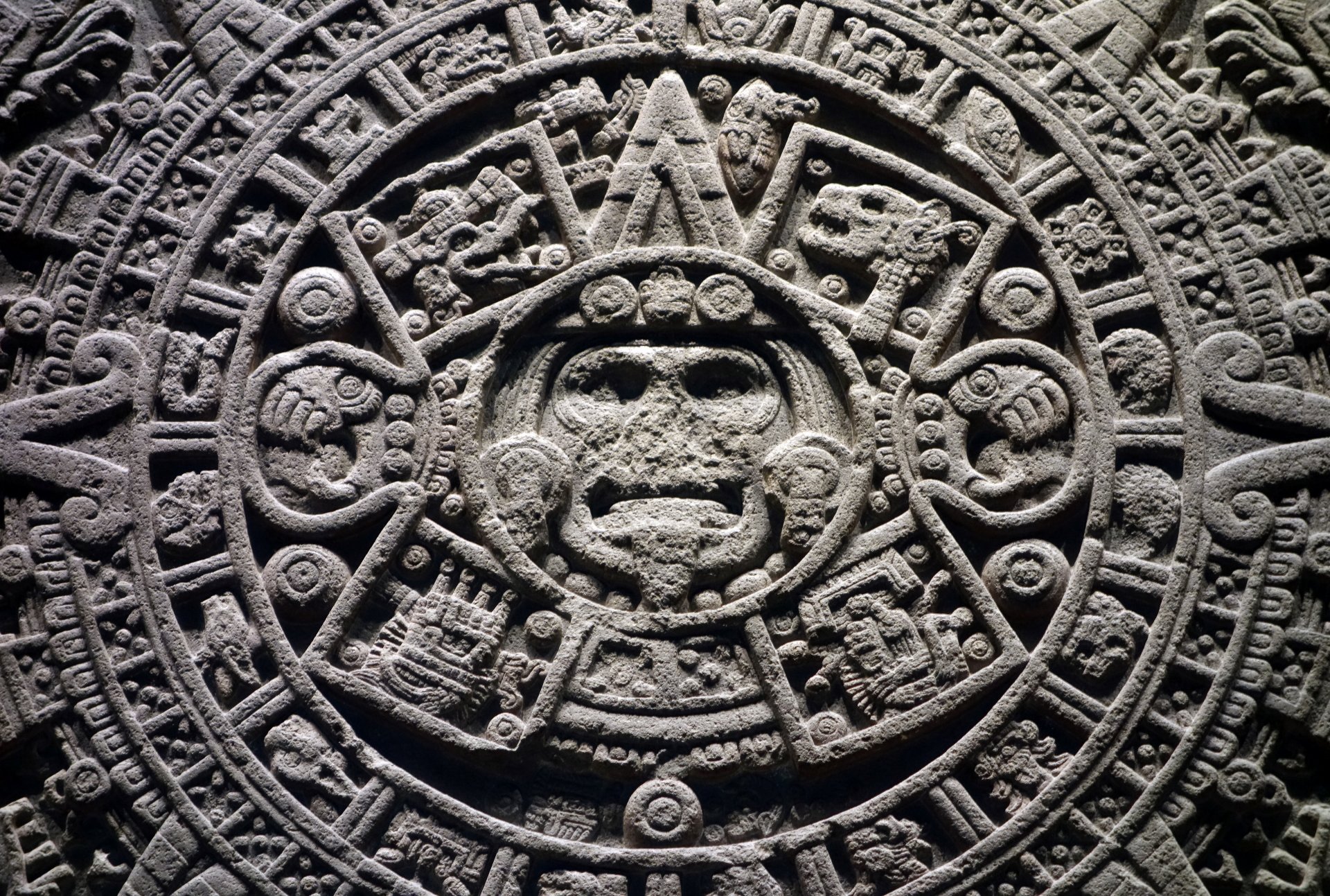 Calendario Azteca o símbolos inusuales en un emblema redondo sobre un fondo negro