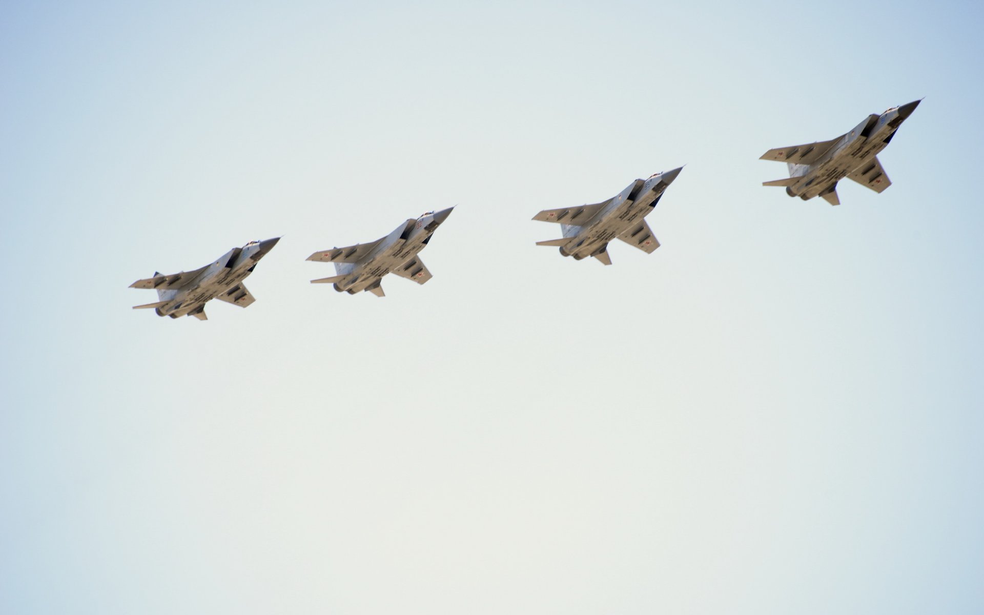 Los aviones MIG-31 vuelan en el cielo en el espectáculo Aéreo