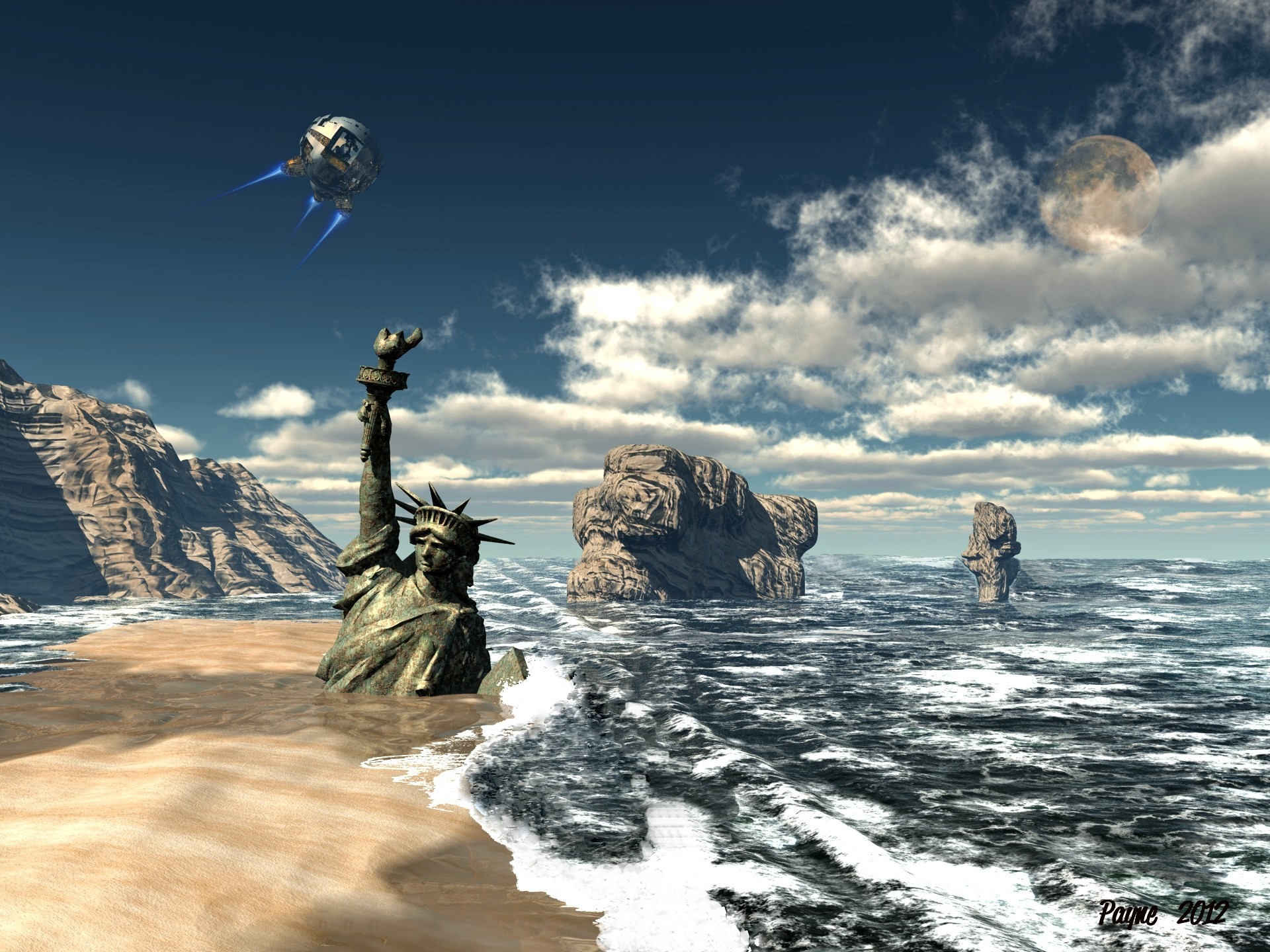La estatua de la libertad sobresale de la arena en la orilla del marLa estatua de la libertad sobresale de la arena en la orilla del mar