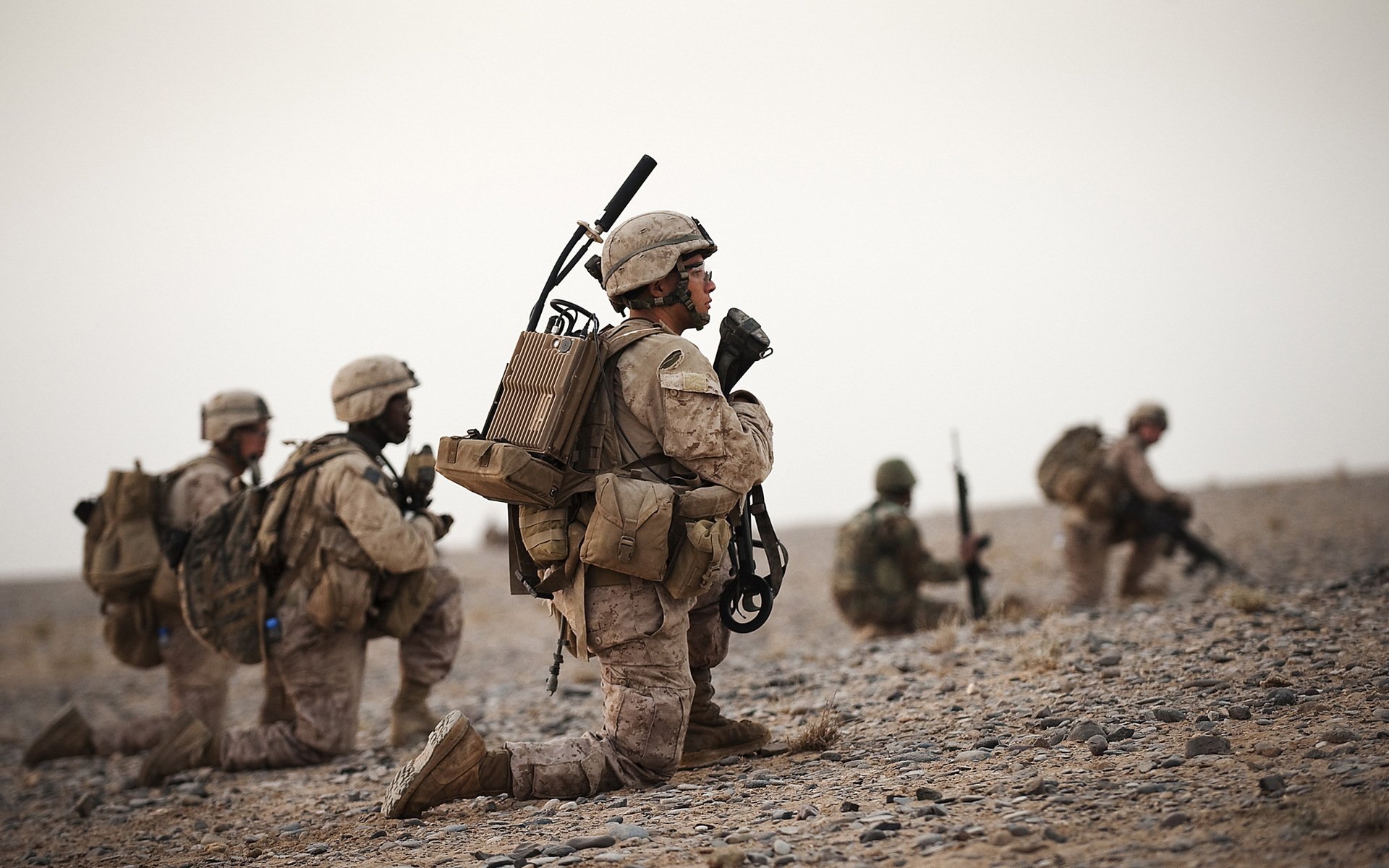 Los soldados siguientes en la hermosa puesta de solLos soldados siguientes en la hermosa puesta de sol