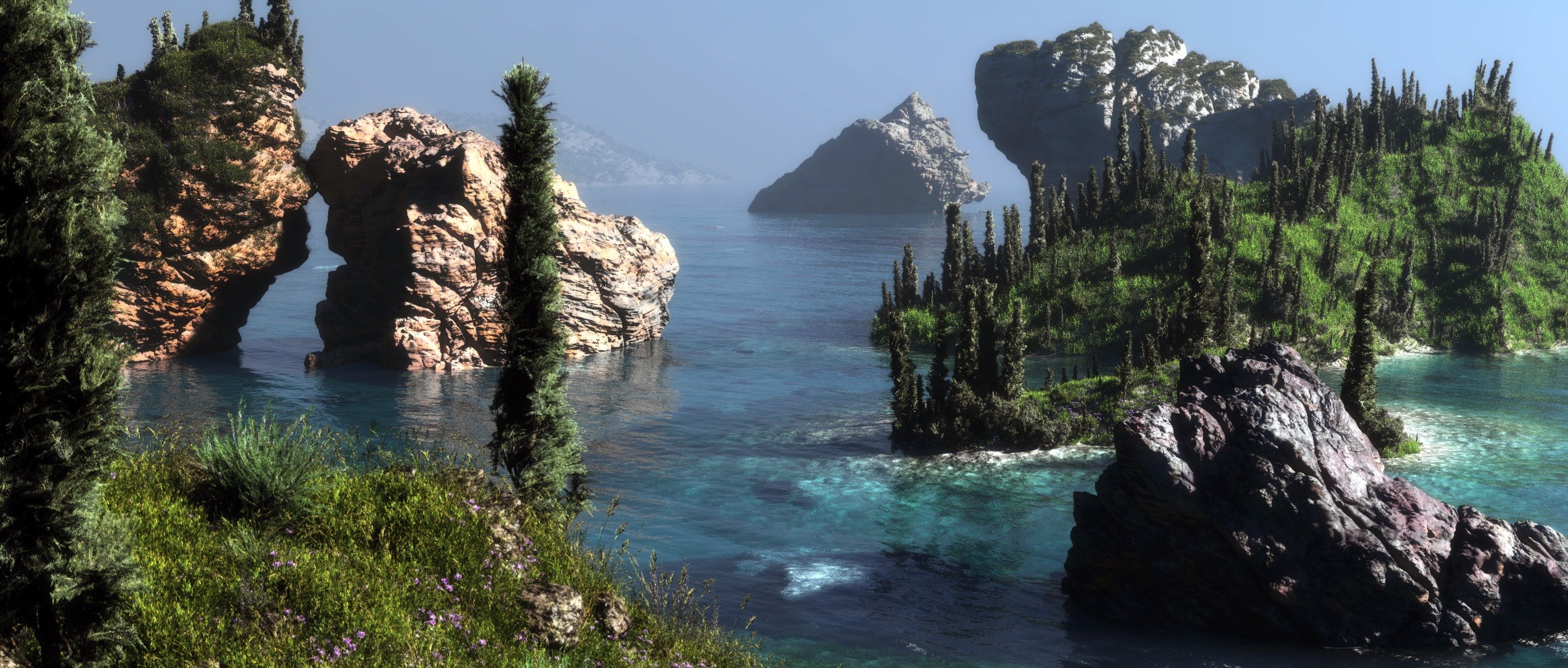 Panorama de montañas verdes y colinas con valle de bosque y superficie de aguaPanorama de montañas verdes y colinas con valle de bosque y superficie de agua