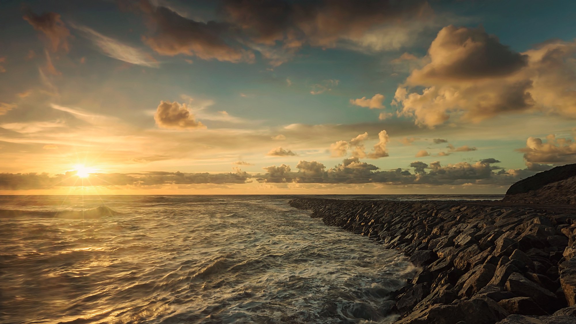 Amanecer soleado con olas de mar