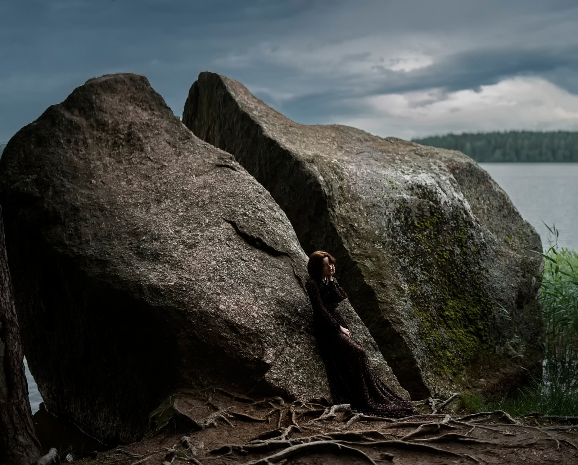 Hermosa chica en el fondo de una enorme piedra