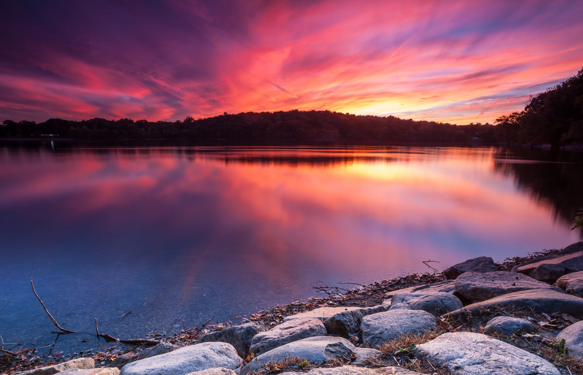 Amanecer carmesí a orillas de un lago tranquilo y aislado