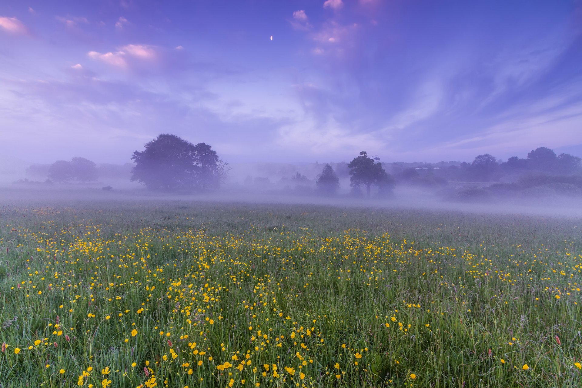 Brumoso amanecer en un campo con rocío caído