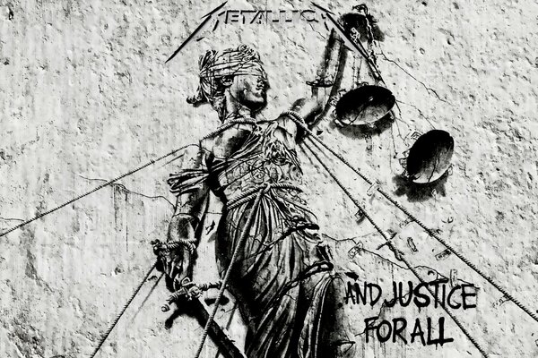 Portada del álbum metallica themis con los ojos vendados, libra en las manosPortada del álbum Metallica Themis con los ojos vendados, libra en las manos