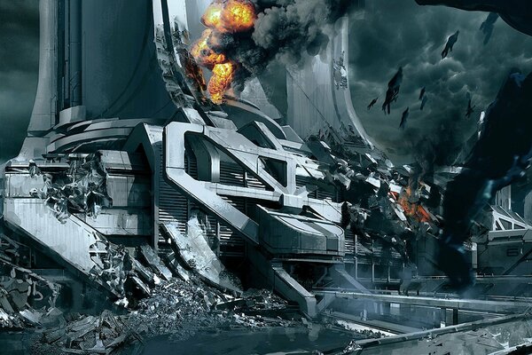 Barco en ruinas de la ciudad en llamas