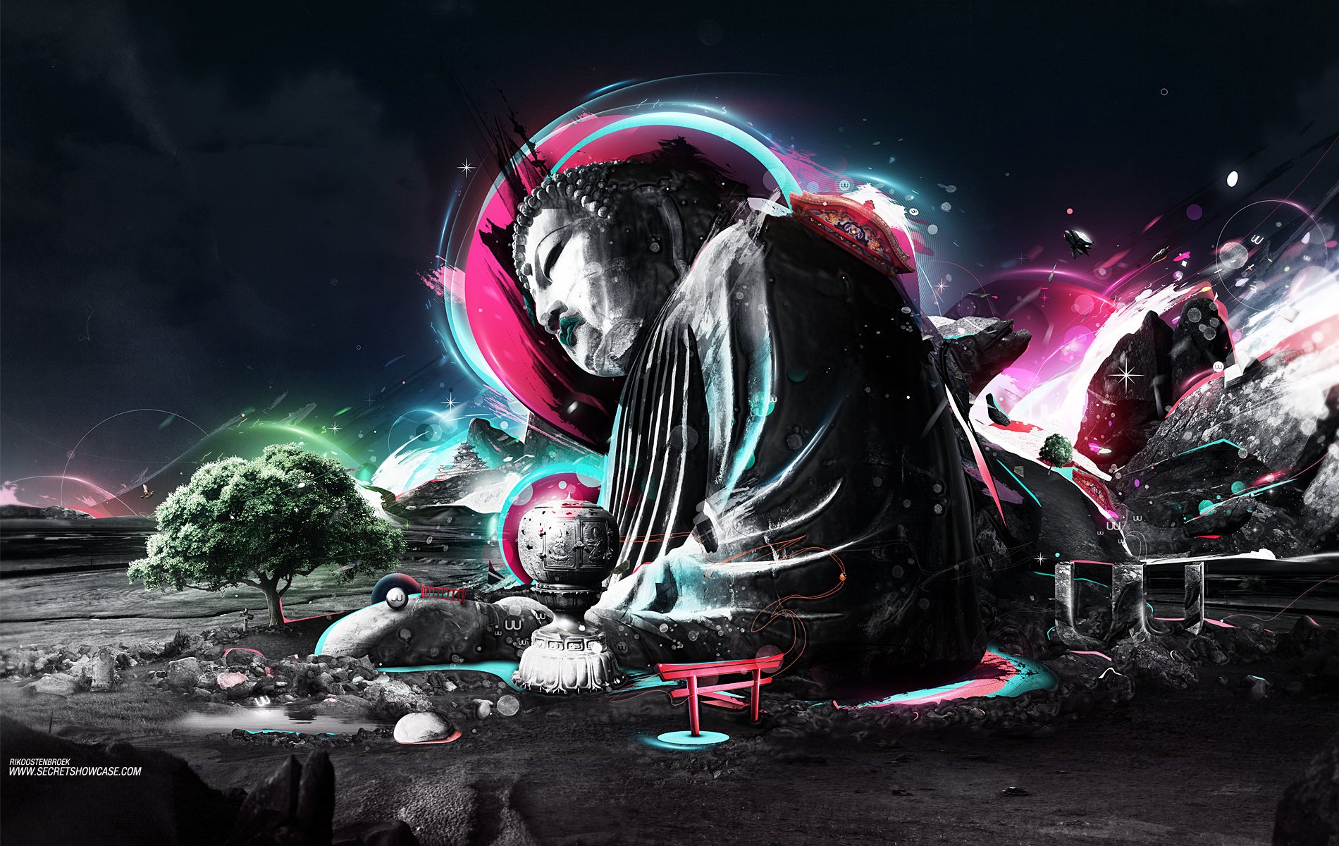 Escultura de piedra de buda en el espacio desérticoEscultura de piedra de Buda en el espacio desértico