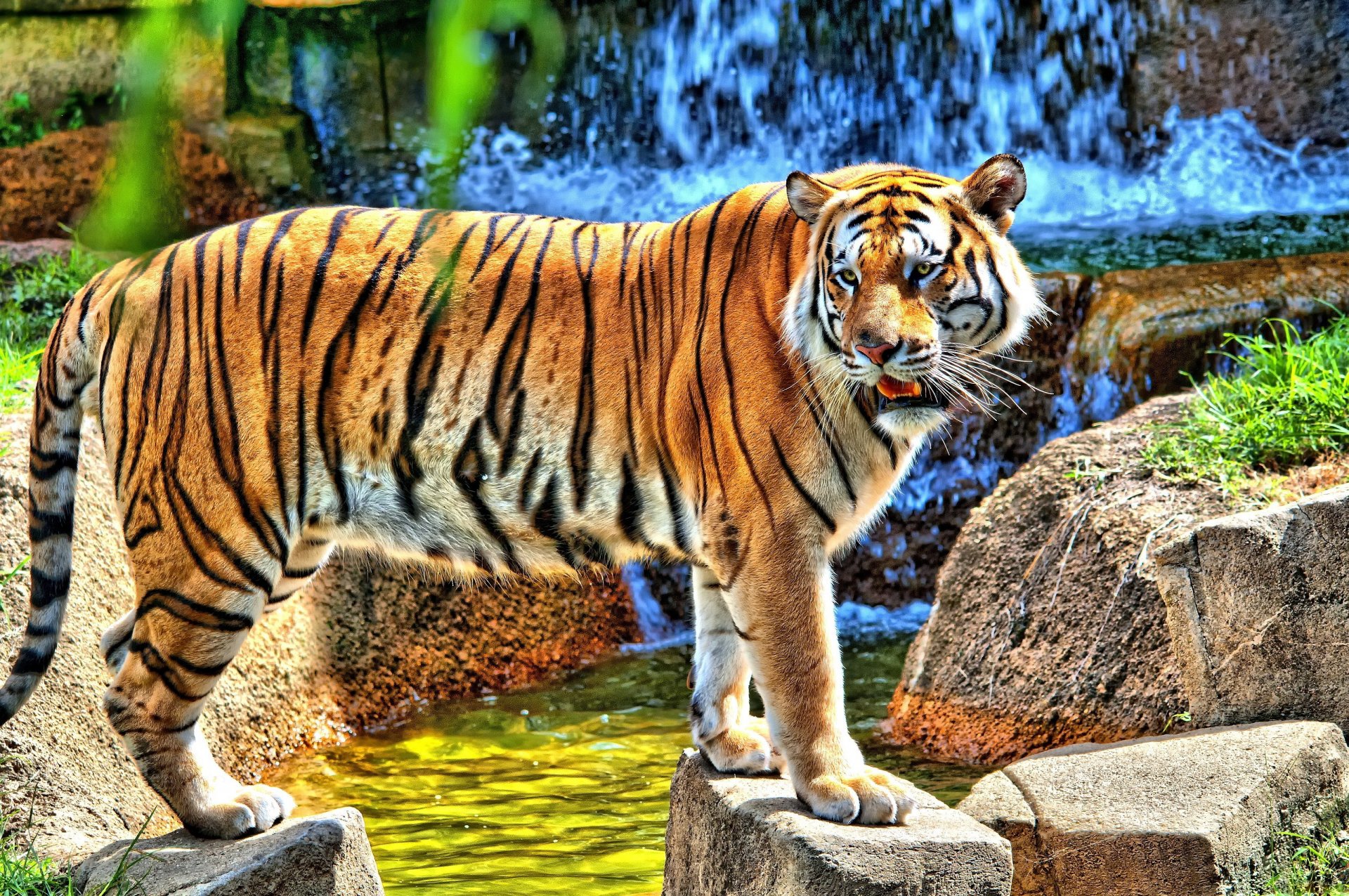Un tigre yace en el suelo bajo los rayos del sol y mira a la cámaraUn tigre yace en el Suelo bajo los rayos del sol y Mira a la cámara