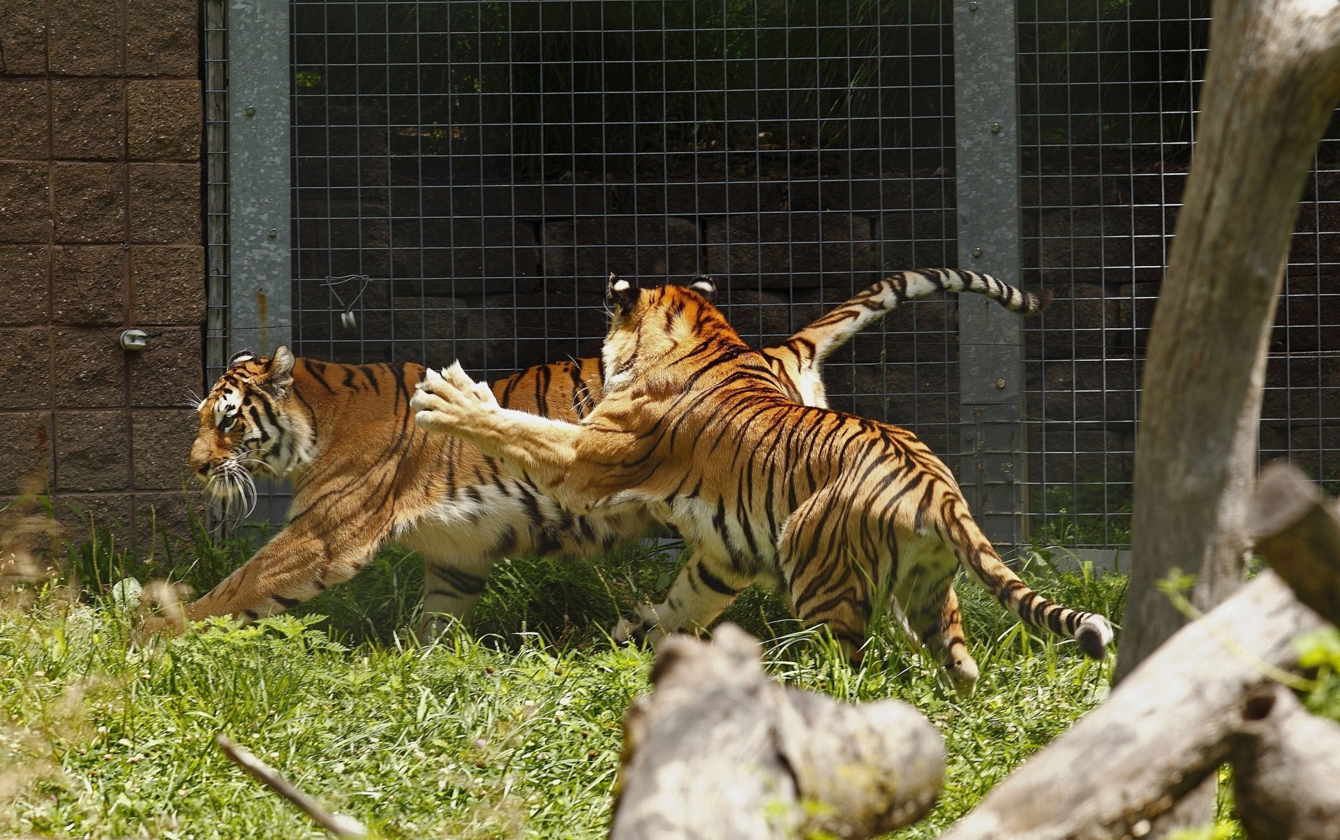 Dos tigres felices jugando en la hierba