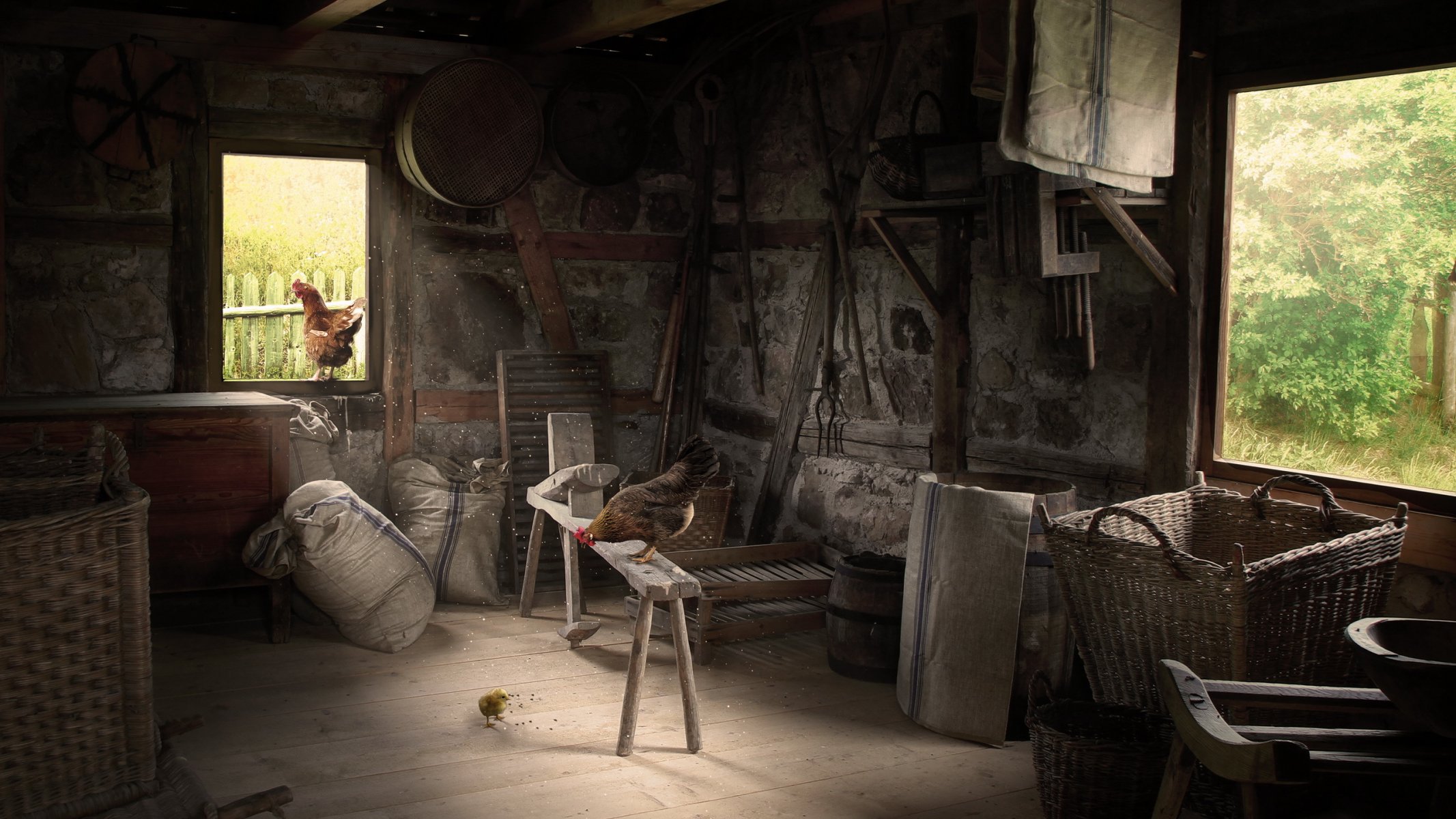 Granero rústico con gallinas y todo tipo de utensiliosGranero rústico con gallinas y todo tipo de utensilios