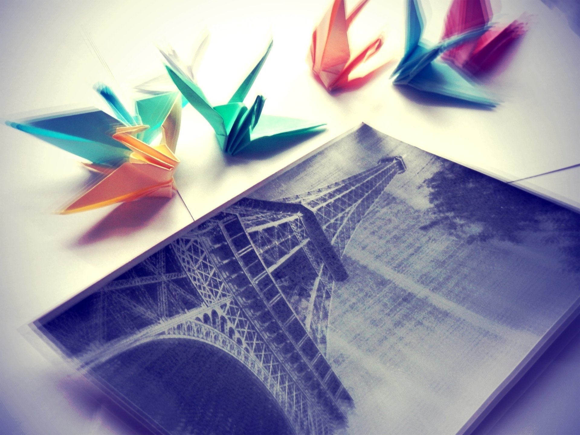 Grullas de origami junto a una foto de la torre eiffelGrullas de origami junto a una foto de la torre Eiffel