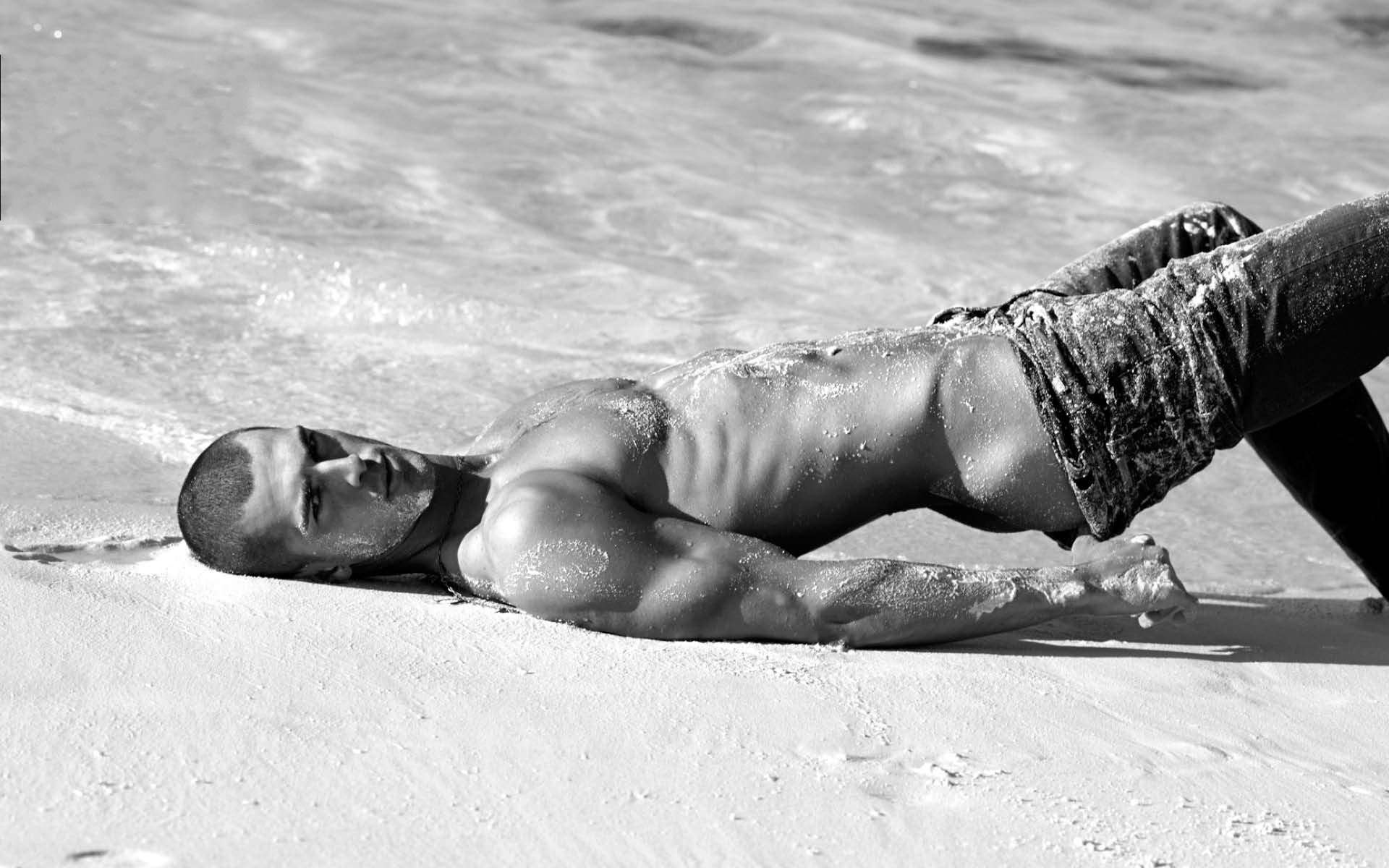 Foto blanca negra de un chico musculoso guapo en una pose erótica en la arenaFoto blanca negra de un chico musculoso guapo en una pose erótica en la arena