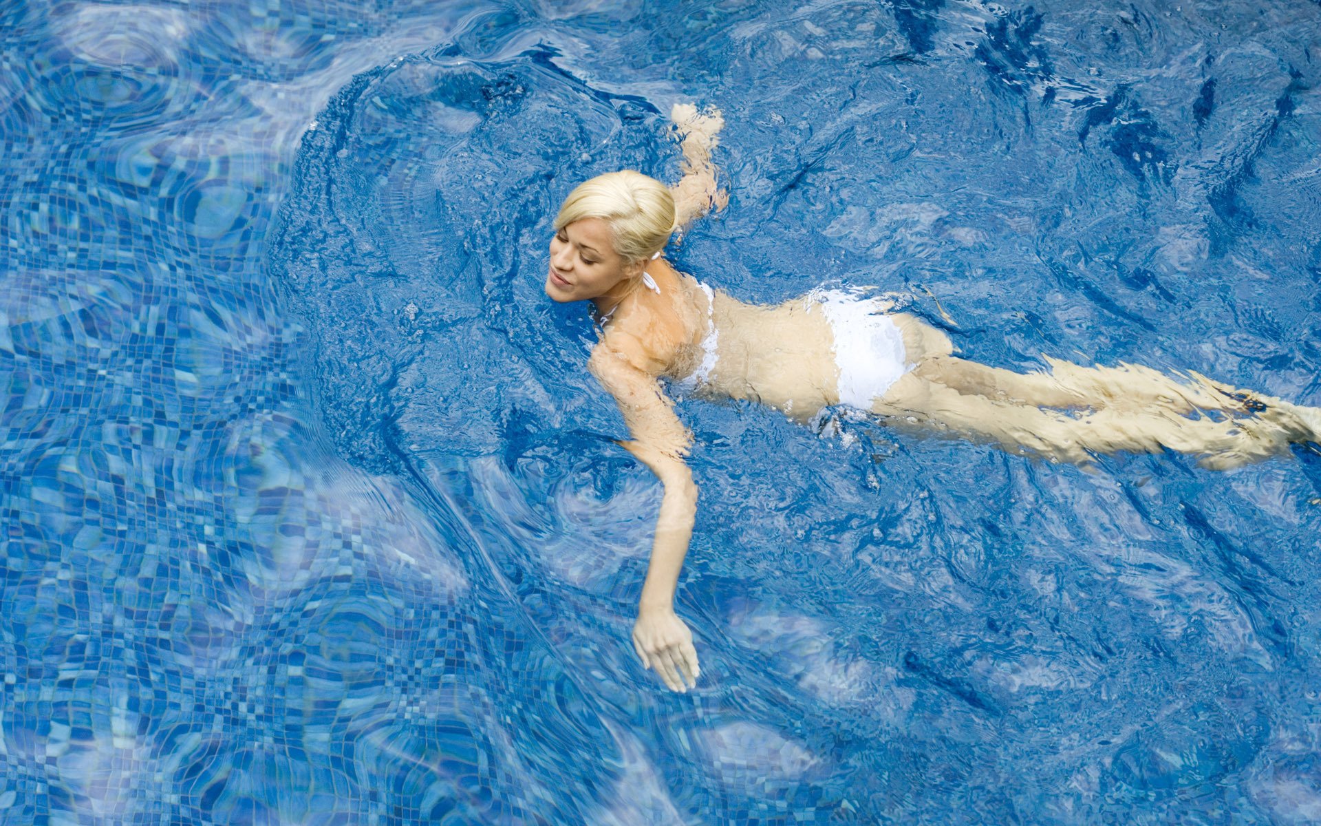 Chica rubia en traje de baño blanco nadando en el aguaChica rubia en traje de baño blanco nadando en el agua