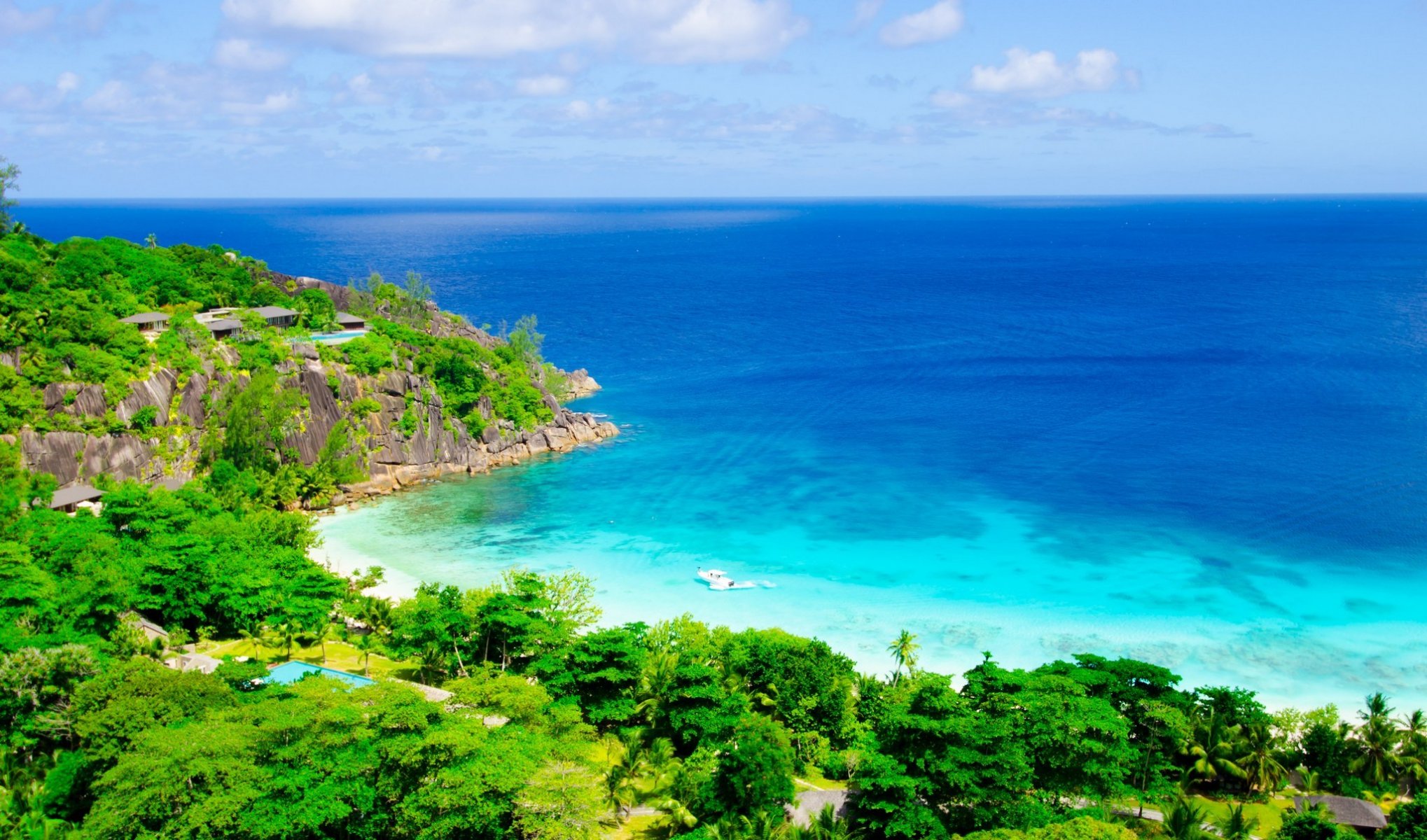Isla tropical con costa de arena, grandes rocas y palmeras