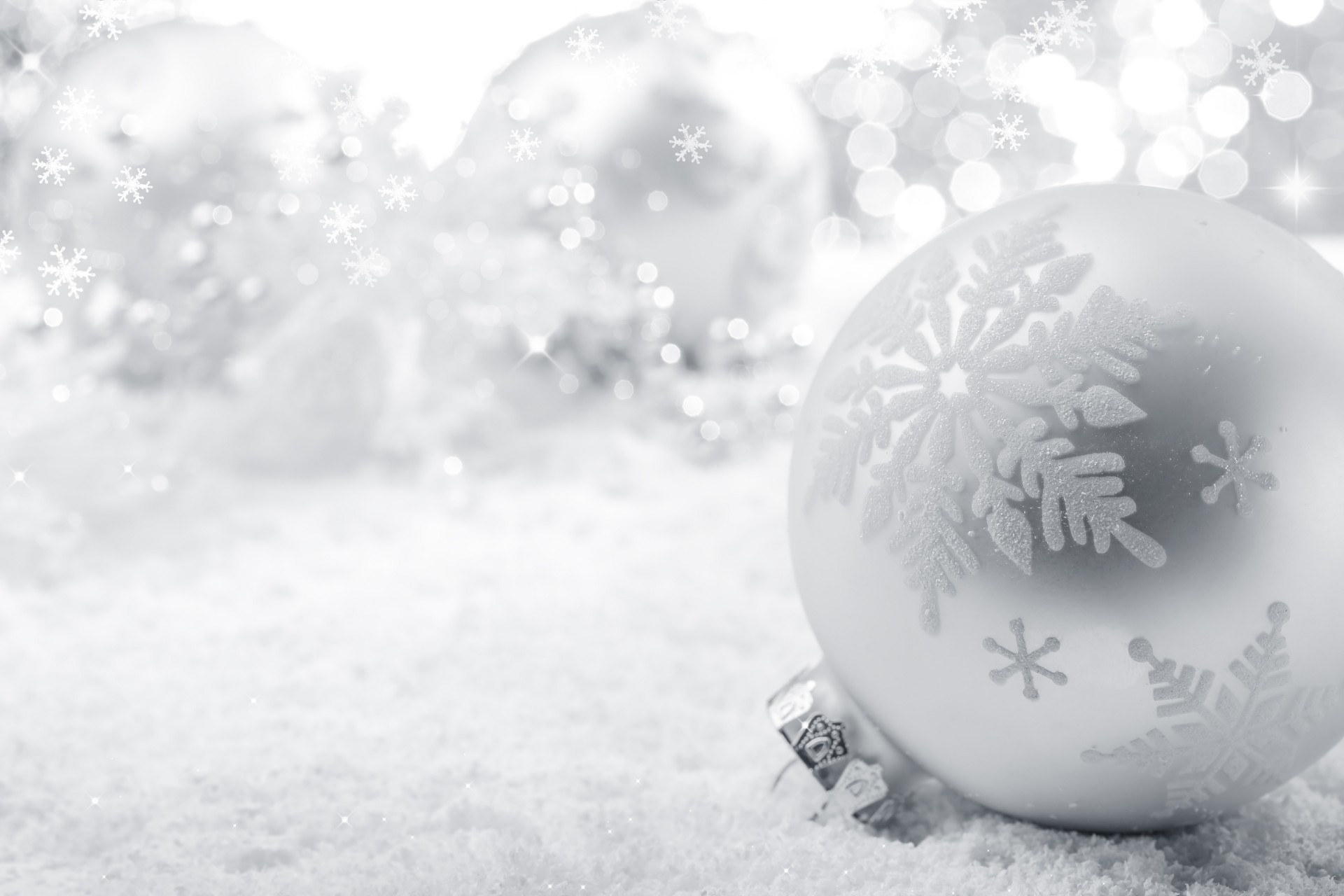 Un juguete festivo y plateado sobre un fondo de copos de nieveUn juguete festivo y plateado sobre un fondo de copos de nieve