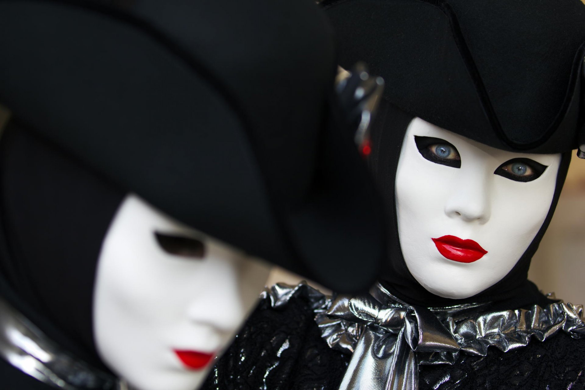 Imagen de carnaval con máscara pálida, ojos brillantes y labiosImagen de carnaval con máscara pálida, ojos brillantes y labios