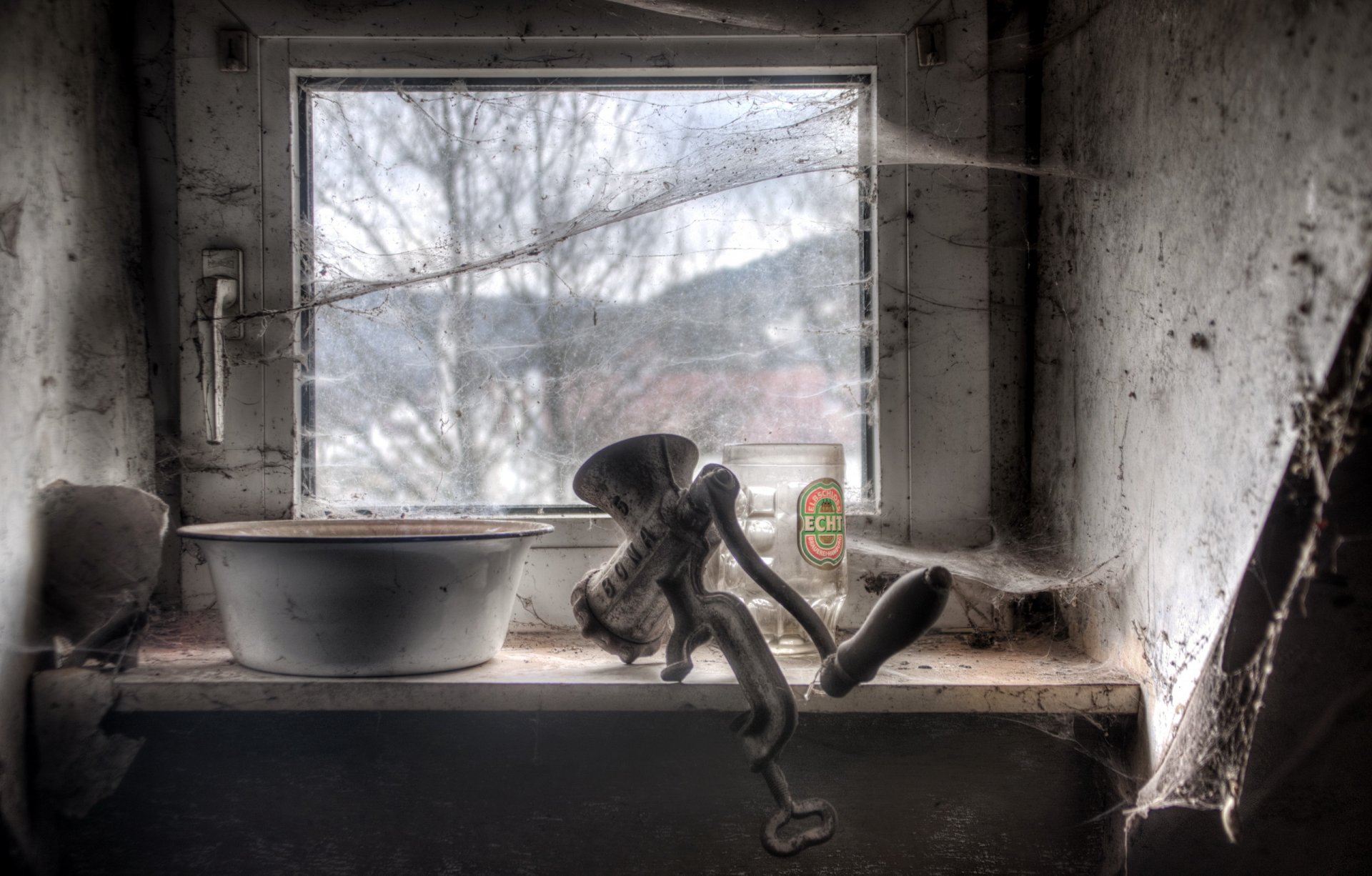 Jaula en la mesa debajo de la ventana con telarañasJaula en la mesa debajo de la ventana con telarañas