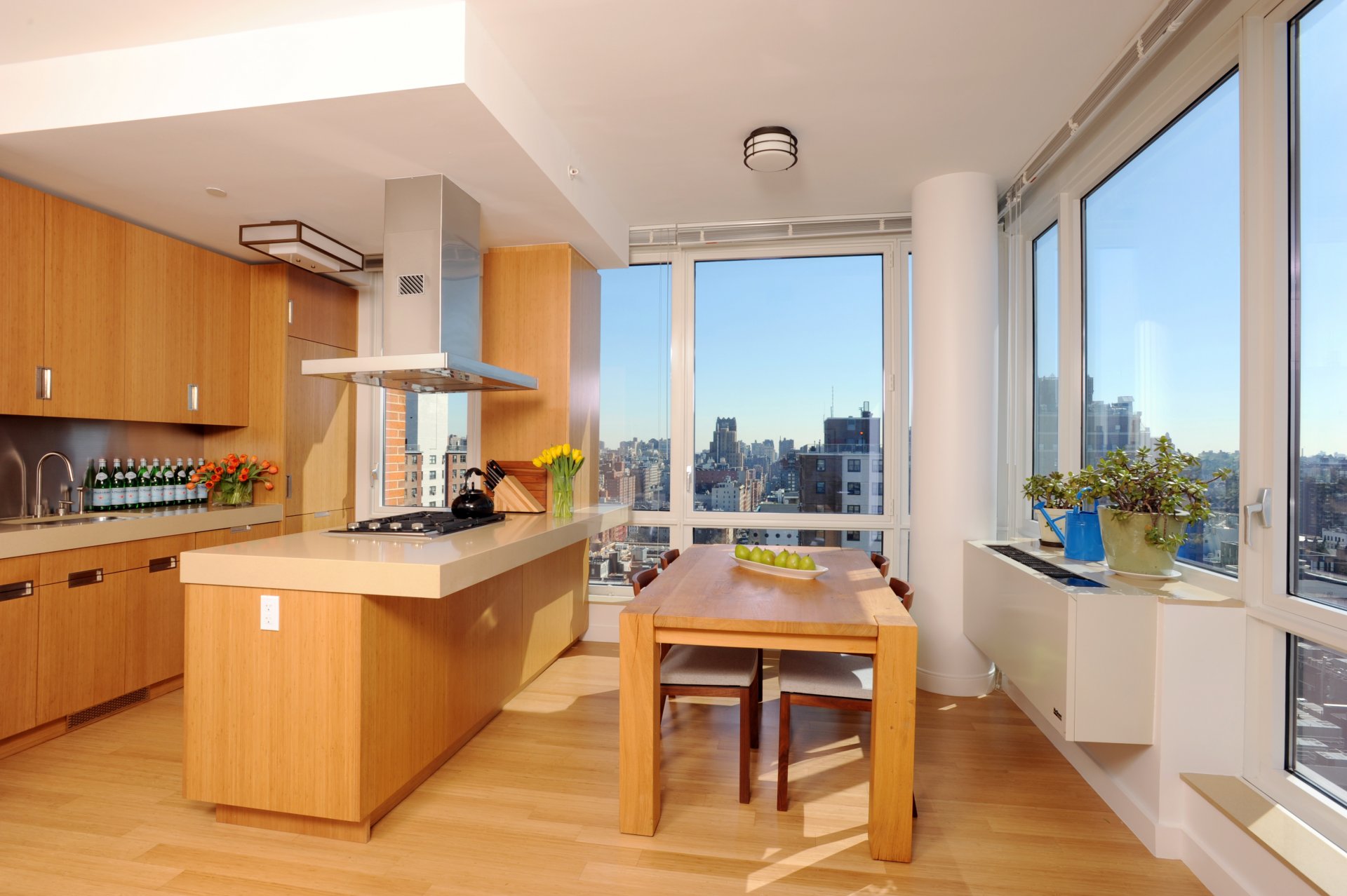 Diseño de sala de estar con enormes ventanas y acentos brillantesDiseño de sala de estar con enormes ventanas y acentos brillantes
