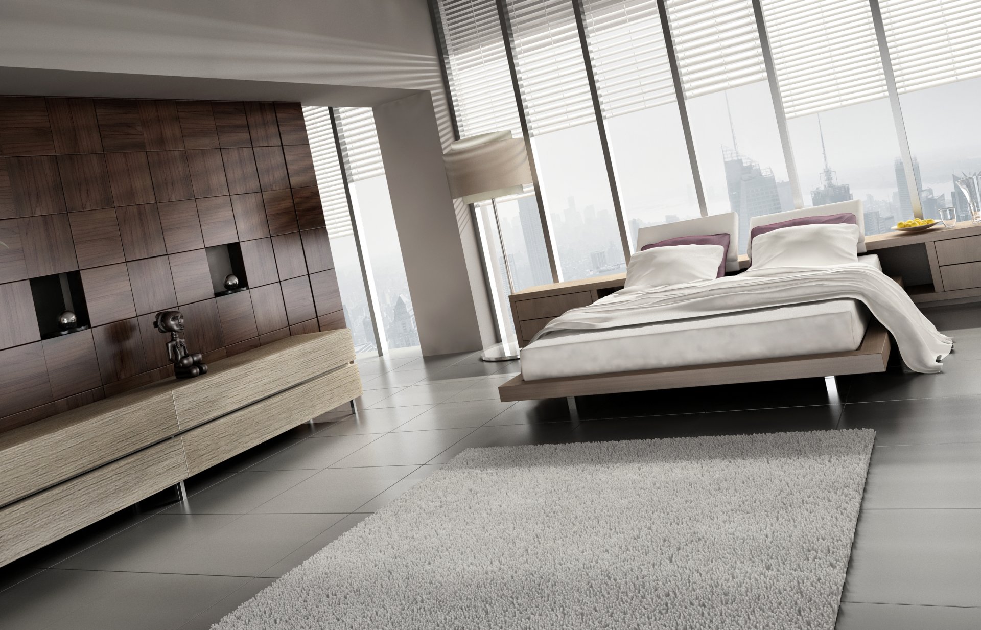 Elegante interior del dormitorio con ventanas panorámicasElegante interior del dormitorio con ventanas panorámicas