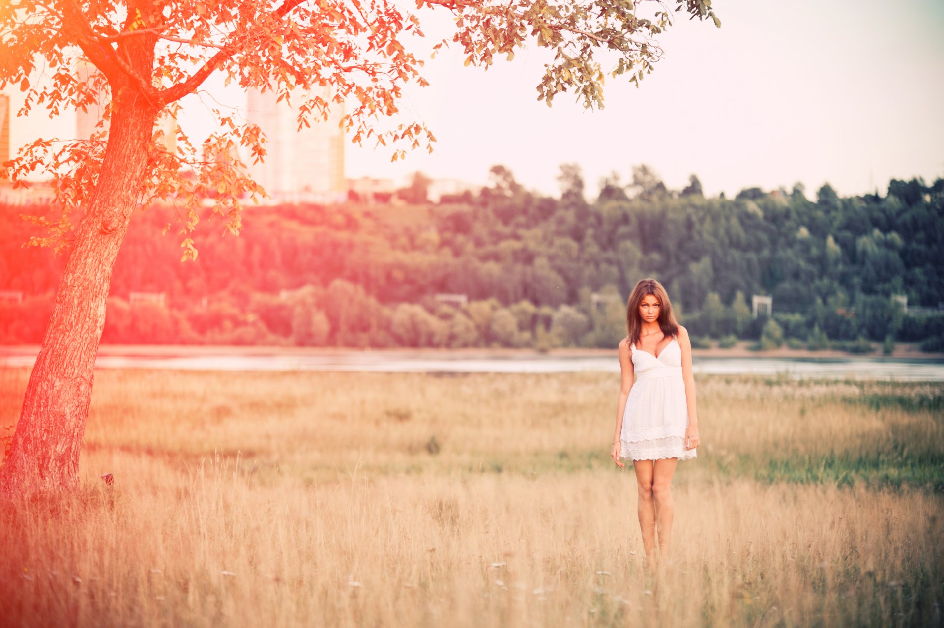 Chica en un vestido blanco en un hermoso campo