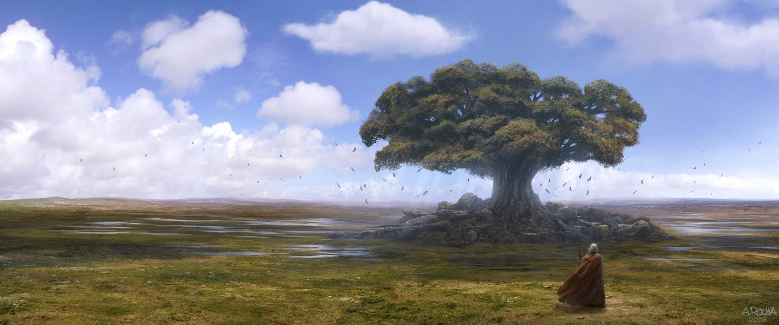 Un viajero que camina hacia un árbol en medio de las nubesUn viajero que camina hacia un árbol en medio de las nubes
