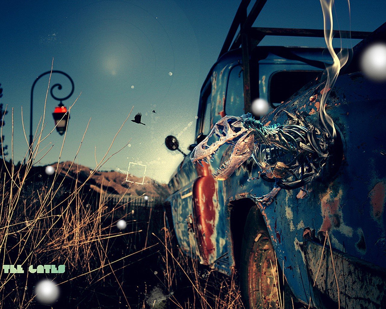 Pelirroja chica con un largo vestido blanco y zapatos de pie sobre el esqueleto en un viejo local
