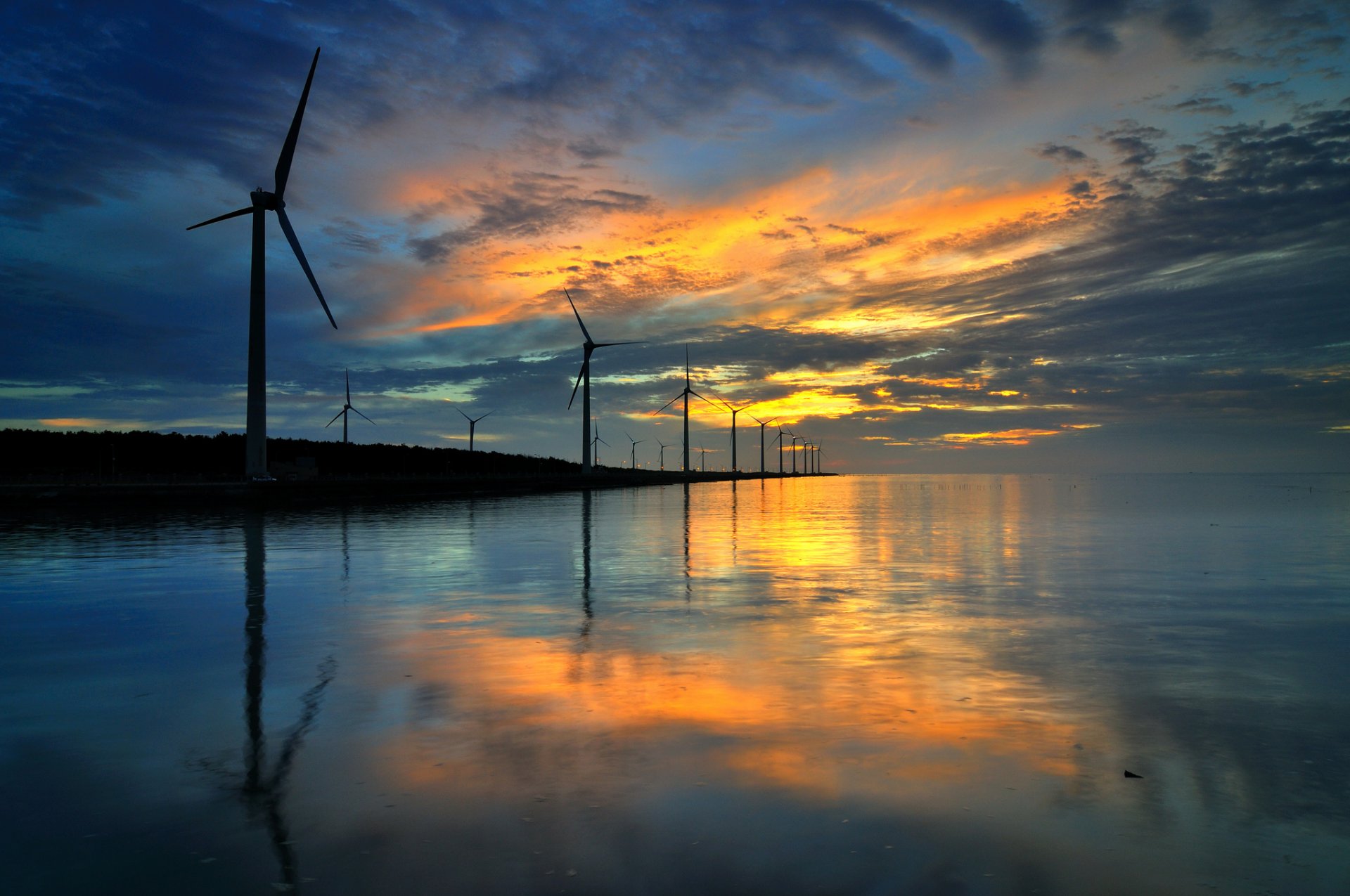 Molinos de viento crepusculares en el fondo del aguaMolinos de viento crepusculares en el fondo del agua