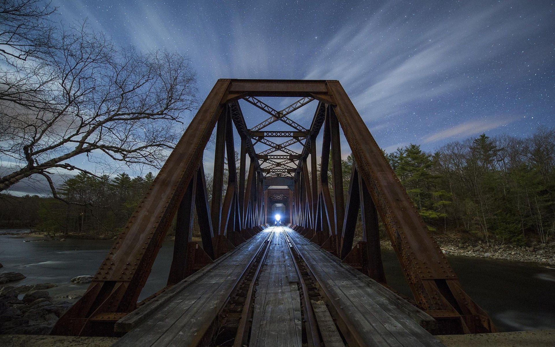 Tren que se acerca en la noche sobre el río