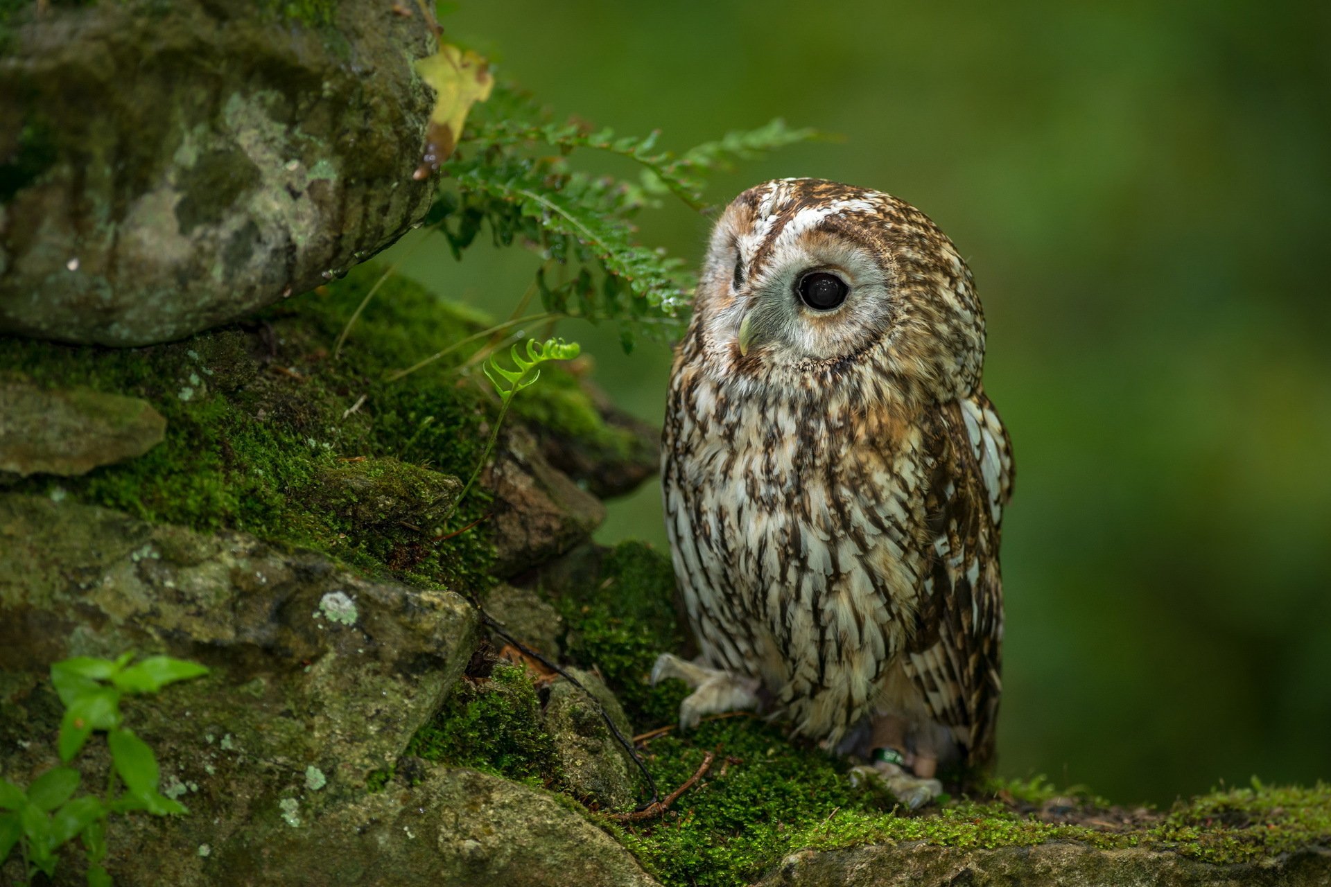 El búho se sienta en un tronco cubierto de musgo en un bosque oscuro