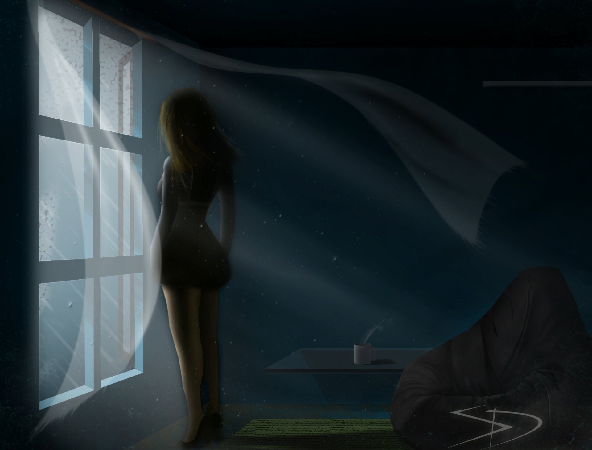 Imagen de una niña mirando por la ventana de la noche