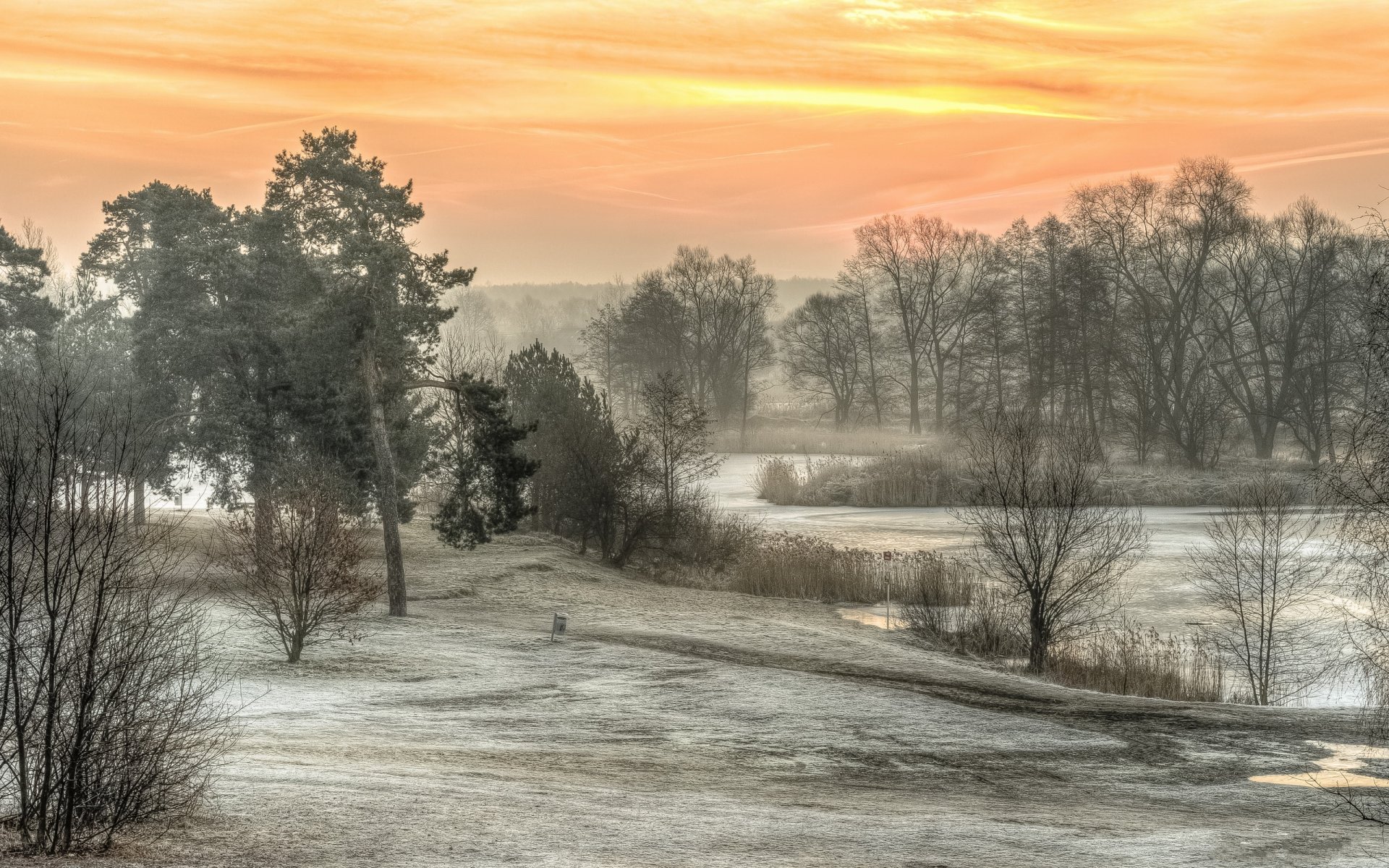 Mañana soleada y helada en la naturaleza