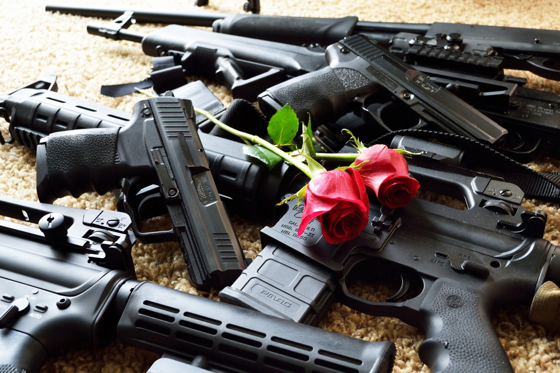Dos pistolas yacen una al lado de la otra en una losa de piedraDos pistolas yacen una al lado de la otra en una losa de piedra