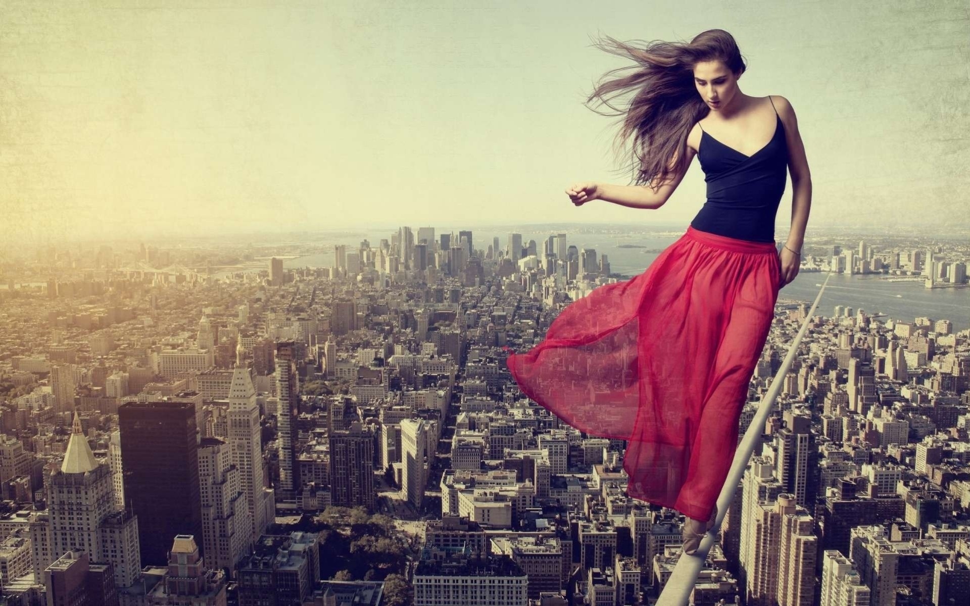 Chica en un poste en lo alto de la ciudad