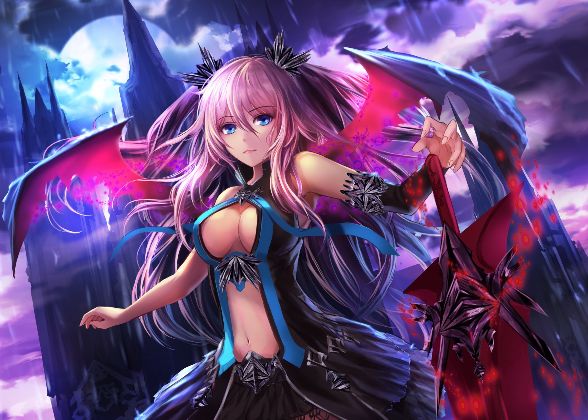 Una joven con el pelo azul en un vestido futurista y con alas de arboleda se cierne sobre la ciudadUna joven con el pelo azul en un vestido futurista y con alas de arboleda se cierne sobre la ciudad